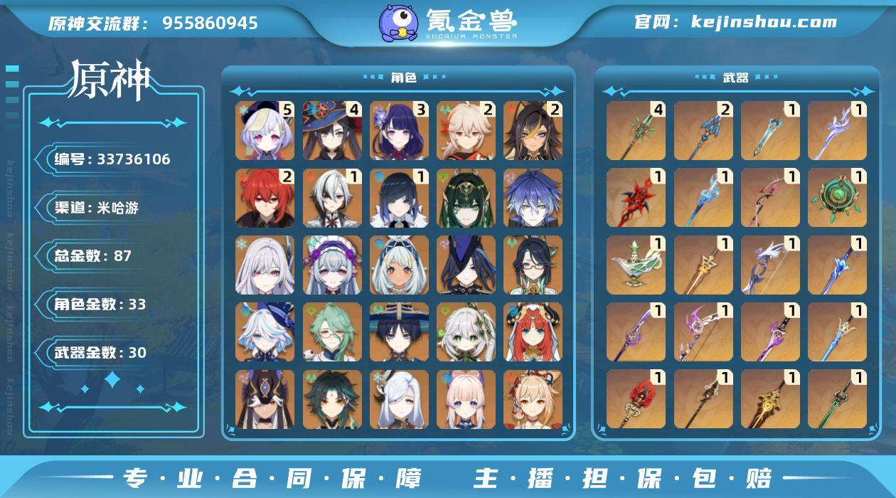 60级/87黄/男主/33个五星角色/30个五星武器 0命克洛琳德,1命阿蕾奇诺,0命闲云,0命芙宁娜,0命白术,2命迪希雅,0命流浪者,0命纳西妲,0命妮露,0命赛诺,0命提纳里,1命夜兰,0命申鹤,3命雷电将军,2命枫原万叶,0命神里绫华,0命钟离,0命甘雨,0命魈,0命宵宫,0命温迪,0命达达利亚,0命珊瑚宫心海,0命刻晴,5命七七,0命琴,4命莫娜,2命迪卢克,0命玛拉妮,0命梦见月瑞希,0命丝柯克,0命菲林斯,0命奈芙尔,精1赤月之形,精1静水流涌之辉,精1最初的大魔术,精1碧落之珑,精1苇海信标,精1千夜浮梦,精1圣显之钥,精1若水,精1波乱月白经津,精2息灾,精1薙草之稻光,精1飞雷之弦振,精1雾切之回光,精1苍古自由之誓,精1无工之剑,精1护摩之杖,精1磐岩结绿,精1四风原典,精4和璞鸢,精1天空之脊,精1贯虹之槊,精1天空之翼,精1天空之卷,精1风鹰剑,精1天空之傲,精1苍耀,精1狼的武功歌
