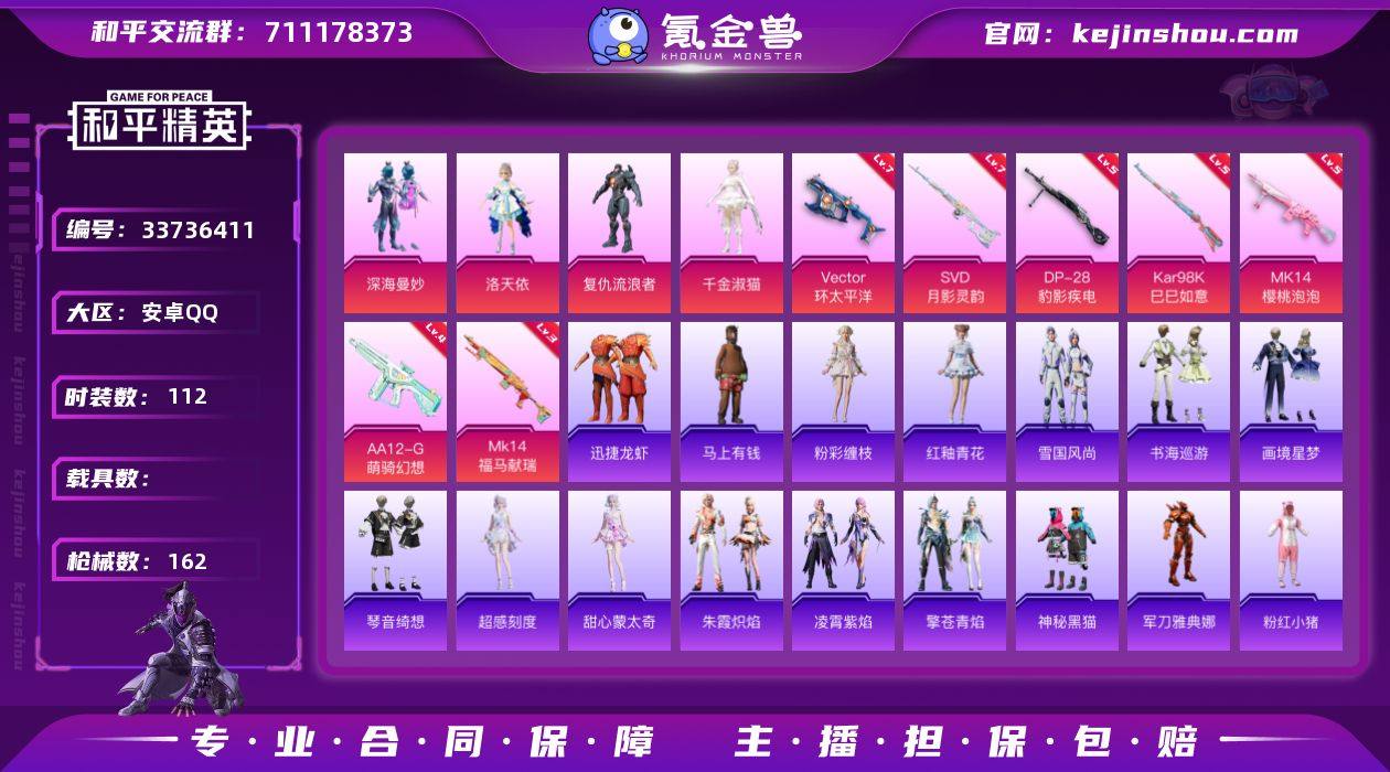 【kyhp1384】安卓 手Q-4粉装-7特效枪-0载具-2粉色飞行器-46921热力值-6王牌印记-112套装-162枪皮 【热门品类】:角色-军刀雅典娜,套装-粉红小猪 【粉色套装】:粉装-深海曼妙,角色-洛天依,角色-复仇流浪者,角色-千金淑猫 【粉色枪皮等级】:Vector-环太平洋(七级),Kar98K-巳巳如意(五级),Mk14-樱桃泡泡(五级),Mk14-福马献瑞(三级),SVD-月影灵韵(七级),AA12-G-萌骑幻想(四级),DP-28-豹影疾电(五级) 【粉色枪皮】:Vector-环太平洋,Kar98K-巳巳如意,Mk14-樱桃泡泡,Mk14-福马献瑞,SVD-月影灵韵,AA12-G-萌骑幻想,DP-28-豹影疾电 【粉色飞行器】:绝对恒星飞行器,炫彩糖果飞行器 【粉色降落伞】:绝对恒星降落伞,PEL轰鸣竞梦者降落伞,古堡领主降落伞,洛神天依降落伞,环太平洋降落伞,月影灵韵降落伞,樱桃泡泡降落伞,喜羊羊与灰太狼降落伞,炫彩糖果降落伞 【稀有套装】:套装-巳巳如意,角色-超感刻度,角色-甜心蒙太奇,套装-雪国风尚,套装-炫彩糖果,套装-马上有钱,套装-迅捷龙虾,角色-都市丽猫,套装-燕燕于飞,套装-鱼渊荷华,角色-蜜桃派对,套装-粉恋花,套装-紫幽梦,套装-蓝冰羽,套装-彩虹兔,套装-云朵鹅,套装-雪绒豹,套装-朱霞炽焰,套装-...