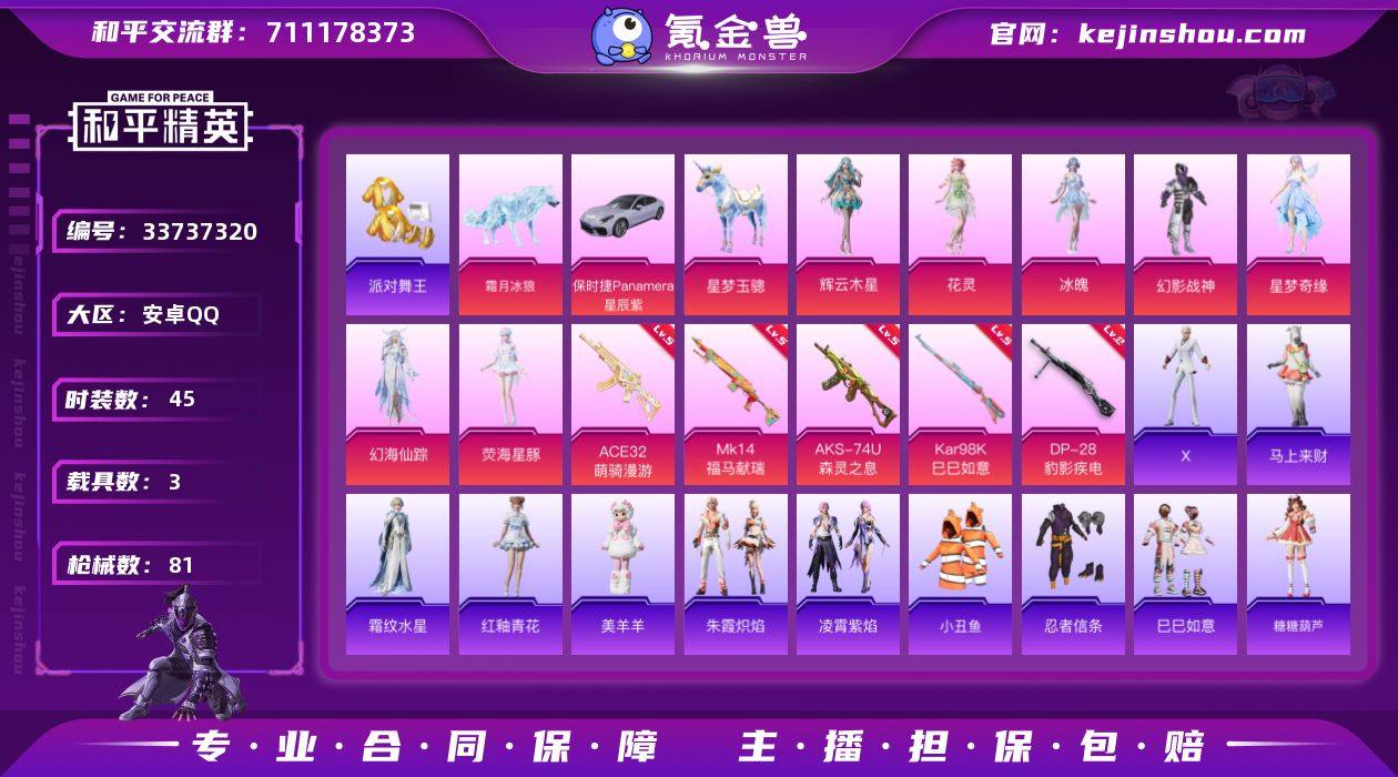安卓 手Q-7粉装-5特效枪-3载具-2粉色飞行器-26031热力值-1王牌印记-45套装-81枪皮 【热门品类】:套装-派对舞王,套装-小丑鱼,套装-忍者信条 【粉色套装】:粉装-幻影战神,角色-星梦奇缘,角色-幻海仙踪,角色-荧海星豚,角色-花灵,角色-冰魄,角色-辉云木星 【粉色枪皮等级】:ACE32-萌骑漫游(五级),AKS-74U-森灵之息(五级),Kar98K-巳巳如意(五级),Mk14-福马献瑞(五级),DP-28-豹影疾电(二级) 【粉色载具】:保时捷Panamera(星辰紫),星梦玉骢,霜月冰狼 【粉色枪皮】:ACE32-萌骑漫游,AKS-74U-森灵之息,Kar98K-巳巳如意,Mk14-福马献瑞,DP-28-豹影疾电 【粉色飞行器】:幻海精灵飞行器,曦光华影飞行器 【粉色降落伞】:幻影战神降落伞,创世·救赎降落伞,精灵之光降落伞,千金淑猫降落伞,月影灵韵降落伞,宁雨蝶降落伞,霁蓝缠春降落伞,辉云木星降落伞 【稀有套装】:套装-巳巳如意,角色-X,套装-马上来财,套装-糖糖葫芦,套装-青团波波,套装-白辉玉蕊,角色-幽澜祭司,套装-朱霞炽焰,套装-凌霄紫焰,玩偶服-美羊羊,套装-雨过天青,套装-红釉青花,角色-霜纹水星 【稀有枪皮】:AKM-环太平洋,AKM-破晓战魂,AKM-龙的传人,AKM-灵猫魔法师,SCAR-L-夜灯...