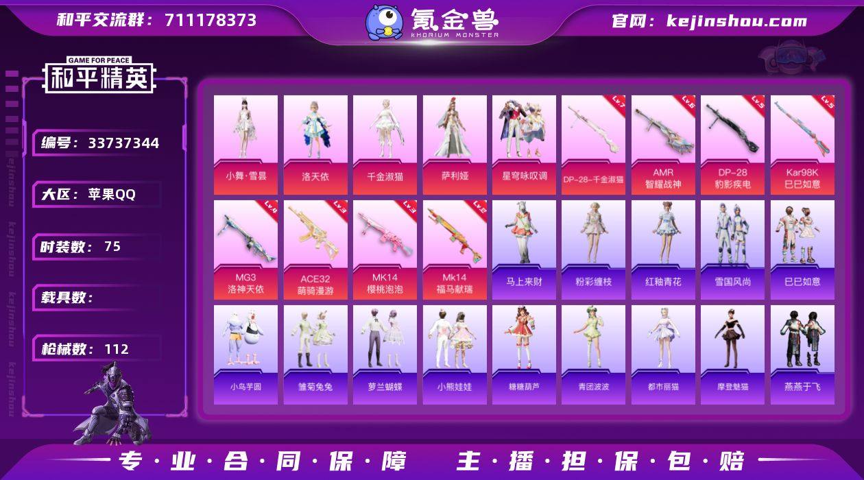 【kyhp1405】苹果 手Q-5粉装-8特效枪-0载具-2粉色飞行器-34659热力值-7王牌印记-75套装-112枪皮 【粉色套装】:角色-洛天依,角色-千金淑猫,角色-萨利娅,粉装-星穹咏叹调,人物-小舞·雪昙 【粉色枪皮等级】:ACE32-萌骑漫游(三级),Kar98K-巳巳如意(五级),Mk14-樱桃泡泡(三级),Mk14-福马献瑞(二级),AMR-智耀战神(六级),DP-28-千金淑猫(七级),DP-28-豹影疾电(五级),MG3-洛神天依(四级) 【粉色枪皮】:ACE32-萌骑漫游,Kar98K-巳巳如意,Mk14-樱桃泡泡,Mk14-福马献瑞,AMR-智耀战神,DP-28-千金淑猫,DP-28-豹影疾电,MG3-洛神天依 【粉色飞行器】:炫彩糖果飞行器,圣域金龙飞行器 【粉色降落伞】:洛神天依降落伞,第五大道降落伞,镜光幻境降落伞,千金淑猫降落伞,圣域龙灵降落伞,智耀战神降落伞,星穹咏叹调降落伞,辉羽雀灵降落伞,荧海星豚降落伞,桃源时光降落伞,异瞳寒姬降落伞,炫彩糖果降落伞,小舞降落伞 【稀有套装】:套装-巳巳如意,套装-小鸟芋圆,套装-雪国风尚,套装-马上来财,套装-雏菊兔兔,套装-萝兰蝴蝶,套装-小熊娃娃,套装-糖糖葫芦,套装-青团波波,角色-都市丽猫,角色-摩登魅猫,套装-燕燕于飞,套装-鱼渊荷华,角色-糖霜甜心,角色-蜜...