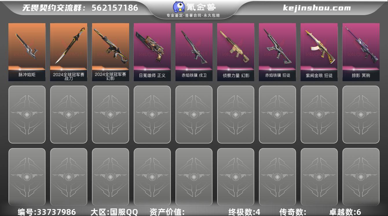 【Hww813】国服Q区 皮肤价值19170 【4橙皮 0金皮 6紫皮 15皮肤 27英雄 60卡面 435已用源晶】黄金 优质皮肤:24套、狂徒-紫阙金琅、幻影-侦察力量 【套装】:2024全球冠军赛套装,赤焰铁骥套装 【英雄】:幻棱,炼狱,维斯,暮蝶,钛狐,壹决,铁臂,捷风,雷兹,幽影,不死鸟,贤者,猎枭,蝰蛇,零,芮娜,奇乐,尚勃勒,霓虹,斯凯,夜露,K/O,海神,盖可,黑梦,钢锁 【近战武器】:近战武器-2024全球冠军赛 战刀,近战武器-脉冲焰矩,近战武器-威龙之刃 【狂徒】:狂徒-紫阙金琅,狂徒-赤焰铁骥 【幻影】:幻影-2024全球冠军赛,幻影-侦察力量 【戍卫】:戍卫-赤焰铁骥 【冥驹】:冥驹-掠影 【标配】:标配-超能偶像 【正义】:正义-日冕雄师,正义-超限闪存,正义-纳米打击 【鬼魅】:鬼魅-星云暗涌 【狂怒】:狂怒-蒙太奇 【卡面】:终章:激斗汉堡 卡面,进入射程 卡面,《双城之战》拥抱 卡面,精灵大战 卡面,欢迎来到底城 卡面,南瓜盛典 卡面,VCT CN首冠 卡面,无畏契约:暮蝶 卡面,修车达人 卡面,热舞环节 卡面,正义的化身 卡面,终章:生意人麦宝 卡面,铁之华 卡面,2024全球冠军赛 卡面,时间到 卡面,最高舞台 卡面,声感陷阱设计图 卡面,梦幻奶茶 卡面...