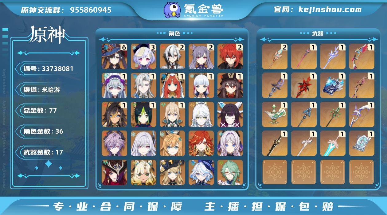 邮箱: 未绑定 总黄数: 77 冒险等级: 60 6命金色角色: 满命莫娜 3命金色角色: 三命七七 2命金色角色: 二命迪卢克,二命刻晴,二命阿蕾奇诺 1命金色角色: 一命神里绫华,一命琴,一命胡桃,一命提纳里,一命妮露,一命迪希雅,一命那维莱特,一命梦见月瑞希 0命金色角色: 温迪,枫原万叶,宵宫,钟离,甘雨,雷电将军,珊瑚宫心海,八重神子,神里绫人,夜兰,纳西妲,白术,芙宁娜,娜维娅,希诺宁,恰斯卡,玛薇卡,茜特菈莉,爱可菲,丝柯克,杜林,哥伦比娅,兹白 拥有武器: 四风原典,和璞鸢,阿莫斯之弓,天空之傲,风鹰剑,斫峰之刃,天空之脊,息灾,千夜浮梦,最初的大魔术,万世流涌大典,赤月之形,赦罪,星鹫赤羽,苍耀,黑蚀 2精武器: 天空之脊 1精武器: 四风原典,和璞鸢,阿莫斯之弓,天空之傲,风鹰剑,斫峰之刃,息灾,千夜浮梦,最初的大魔术,万世流涌大典,赤月之形,赦罪,星鹫赤羽,苍耀,黑蚀 亮点: 【sy237】60级/77黄/男主/36个五星角色/17个五星武器2命阿蕾奇诺,0命娜维娅,0命芙宁娜,1命那维莱特,0命白术,1命迪希雅,0命纳西妲,1命妮露,1命提纳里,0命夜兰,0命神里绫人,0命八重神子,0命雷电将军,0命枫原万叶,1命神里绫华,0命钟离,1命胡桃,0命甘雨,0命宵宫,0命温迪,0命珊瑚宫心海,2命刻晴,3命七七,1命琴,满命莫娜,2命...