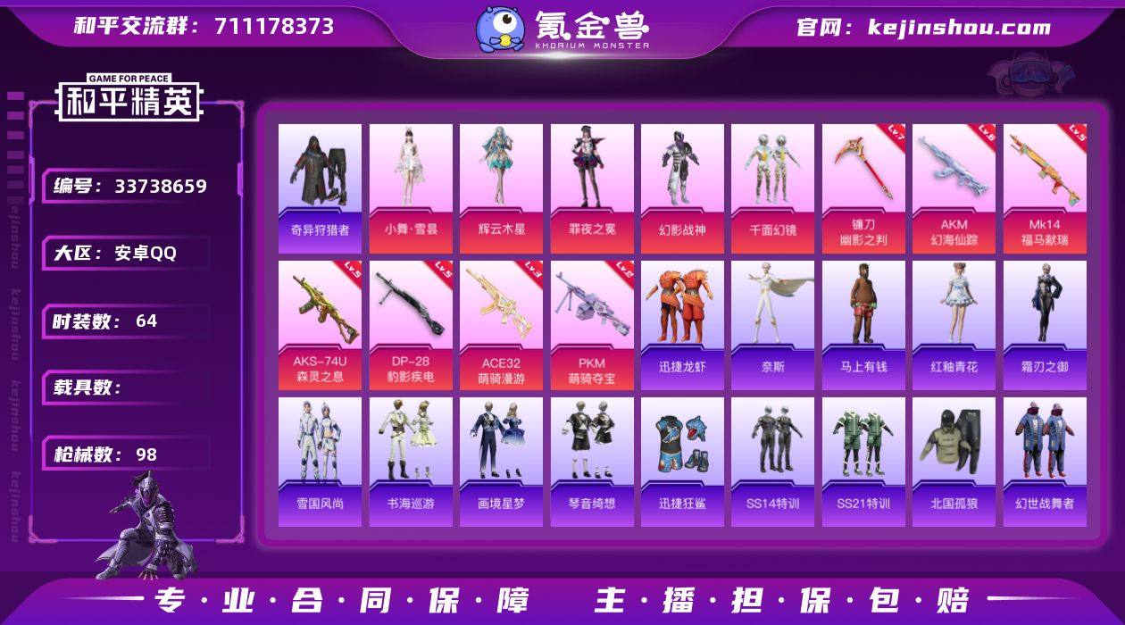 安卓 手Q-5粉装-7特效枪-0载具-1粉色飞行器-29145热力值-4王牌印记-64套装-98枪皮 【热门品类】:套装-奇异狩猎者 【粉色套装】:粉装-幻影战神,粉装-千面幻镜,角色-罪夜之冕,角色-辉云木星,人物-小舞·雪昙 【粉色枪皮等级】:AKM-幻海仙踪(六级),ACE32-萌骑漫游(三级),AKS-74U-森灵之息(五级),Mk14-福马献瑞(五级),DP-28-豹影疾电(五级),PKM-萌骑夺宝(二级),镰刀-幽影之判(七级) 【粉色枪皮】:AKM-幻海仙踪,ACE32-萌骑漫游,AKS-74U-森灵之息,Mk14-福马献瑞,DP-28-豹影疾电,PKM-萌骑夺宝,镰刀-幽影之判 【粉色飞行器】:炫彩糖果飞行器 【粉色降落伞】:香水柠檬降落伞,仲夏莫吉托降落伞,拂晓神骑降落伞,星梦奇缘降落伞,炫彩糖果降落伞,虹云熊熊降落伞 【稀有套装】:套装-雪国风尚,套装-炫彩糖果,角色-奈斯,套装-马上有钱,套装-迅捷龙虾,套装-书海巡游,套装-画境星梦,套装-琴音绮想,角色-霜刃之御,套装-雨过天青,套装-红釉青花 【稀有枪皮】:AUG-冰晶雪宝,AKM-夜灯,AKM-奇异狩猎者,AKM-龙的传人,M16A4-幻世战舞者,SCAR-L-炫彩节奏,SCAR-L-玉兔迎春,M416-绯红前夜,GROZA-治愈之星,GROZA-暮色玫影,QBZ-神秘黑猫,M762-奇异狩猎者,...