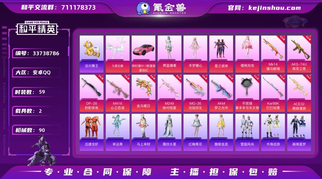 【kyhp1454】安卓 手Q-4粉装-11特效枪-2载具-5粉色飞行器-32074热力值-4王牌印记-59套装-90枪皮 【热门品类】:套装-派对舞王,套装-红熊茄茄 【粉色套装】:粉装-星之彼岸,角色-樱桃泡泡,角色-羊梦糖心,角色-霁蓝缠春 【粉色枪皮等级】:AKM-梦之光华(四级),M416-心之恋语(五级),ACE32-萌骑漫游(一级),AKS-74U-森灵之息(五级),Kar98K-巳巳如意(三级),Mk14-福马献瑞(五级),M249-绝对恒星(四级),DP-28-豹影疾电(五级),MG-36-沧焰双生(四级),信号枪-金乌曜日(四级),平底锅-喜羊羊与灰太狼(三级) 【粉色载具】:保时捷911 敞篷版(星珀红),九霄玄鹿 【粉色枪皮】:AKM-梦之光华,M416-心之恋语,ACE32-萌骑漫游,AKS-74U-森灵之息,Kar98K-巳巳如意,Mk14-福马献瑞,M249-绝对恒星,DP-28-豹影疾电,MG-36-沧焰双生,信号枪-金乌曜日,平底锅-喜羊羊与灰太狼 【粉色飞行器】:绝对恒星飞行器,炫彩糖果飞行器,云梦轻舟飞行器,冰狼掠影飞行器 【粉色降落伞】:绝对恒星降落伞,樱桃泡泡降落伞,无垠阁降落伞,喜羊羊与灰太狼降落伞,炫彩糖果降落伞,灵驹仙姬降落伞,镜花水月降落伞 【稀有套装】:角色-超感刻度,角色-甜心蒙太奇,套装-雪国风尚,套装-炫彩糖...