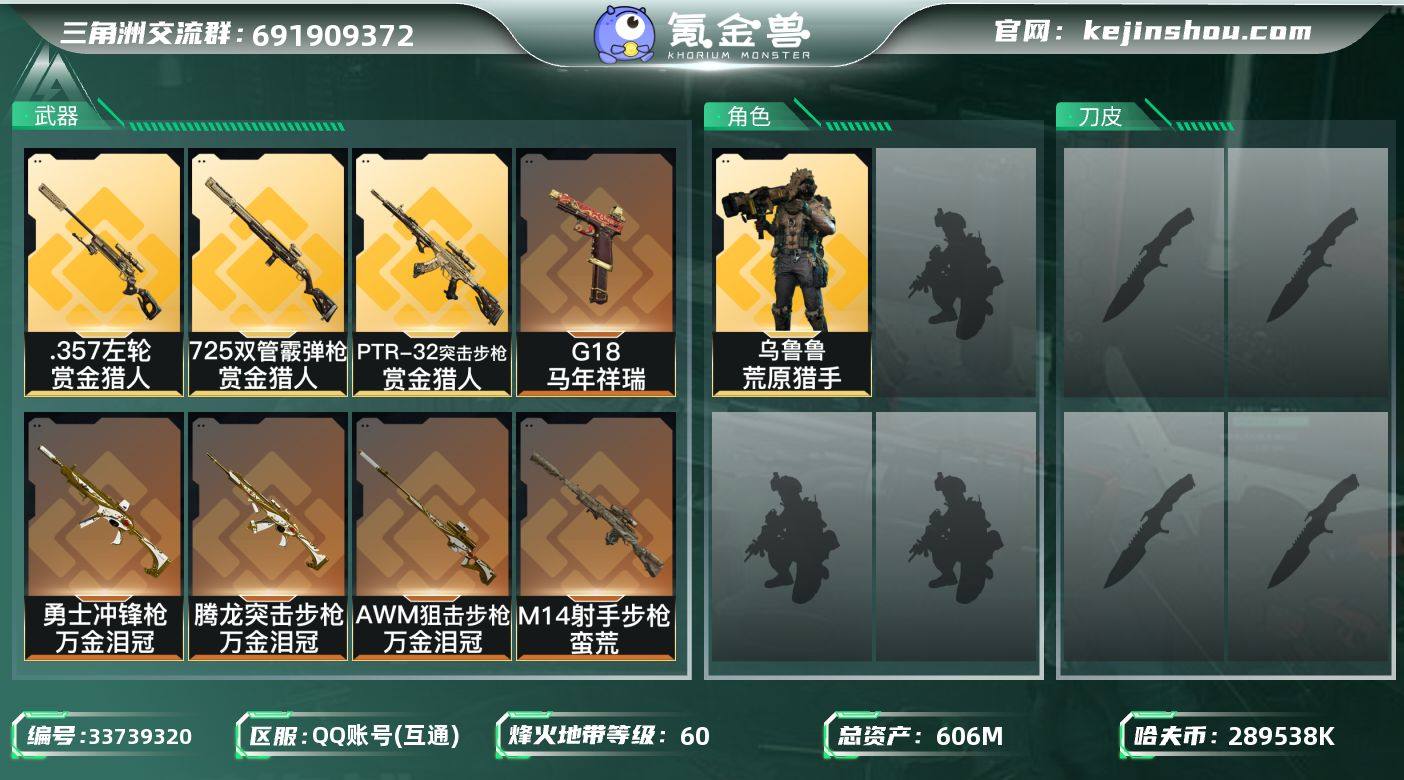【960315】606m总资产-289538k哈夫币-60烽火等级-铂金-1战场等级-无军衔 【干员外观】:乌鲁鲁-荒原猎手 【近战皮肤】:近战-黑鹰 【传说外观】:PTR-32突击步枪-赏金猎人,腾龙突击步枪-万金泪冠,勇士冲锋枪-万金泪冠,725双管霰弹枪-赏金猎人,M14射手步枪-蛮荒,AWM狙击步枪-万金泪冠,.357左轮-赏金猎人,G18-马年祥瑞 【史诗外观】:腾龙突击步枪-檀劫铳影,K416突击步枪-冬日风情,K416突击步枪-腊梅,K437突击步枪-丛影谍踪,SR-3M紧凑突击步枪-开工大吉,勇士冲锋枪-丛影谍踪,MP7冲锋枪-六套之力,M249轻机枪-丛影谍踪,QJB201轻机枪-炽焰,VSS射手步枪-丛影谍踪 【稀有外观】:QBZ95-1突击步枪-海岸线,SG552突击步枪-2026,SG552突击步枪-马年新春,SG552突击步枪-贴花艺术, AK-12突击步枪-马年新春,CAR-15突击步枪-来财,K437突击步枪-生存指令,KC17突击步枪-来财,MK47突击步枪-精英联盟,SMG-45冲锋枪-行动开启,SR-3M紧凑突击步枪-马年新春,MP7冲锋枪-前沿科技,Mini-14射手步枪-荣耀列队,Mini-14射手步枪-来财 【普通外观】:M7战斗步枪-噬菌体,G17-斑马,SKS射手步枪-彩墨涂鸦,QBZ95-1突击步枪-三角洲力量,QBZ95-1突击步枪-2026,K416突击步枪-重击...