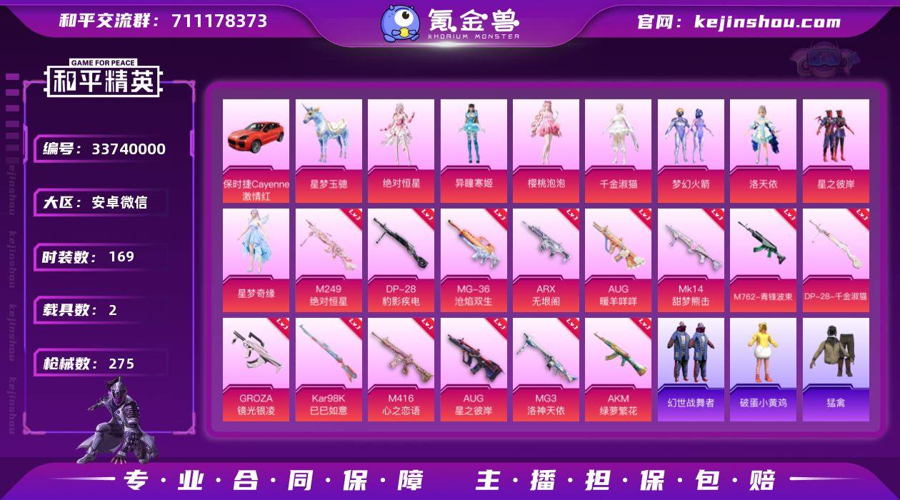 8粉装 15粉枪 2载具 1稀有装备 169套装 275枪皮 36热门 星梦玉骢 保时捷Cayenne(激情红) 巡查衣 稀有紫装--巡查衣 梦幻火箭 洛天依 星之彼岸 绝对恒星 滨海厨神 快乐星愿 星梦畅游 幻羽潜行 极速竞梦 炫蓝之夏 猎梦纪元 牛气满满 猛禽 天籁歌者 电音精灵 耀粉歌者 飞行日记 飞狐塔尔斯 暗夜傀儡 柠萌假日 王牌教练 飞驰魅影 龟仙人 音速流光 无暇誓言 日照花林 涂山之恋 空岛之星 贝斯之夜 惊鸿侠骨 萌趣咩咩 竞技名士 娇憨猪猪 锦衣飞扬 银月精灵 玉兔迎春 快闪甜心 特战装甲 春光漫游 蓝色守护者 日冕精灵 光之冒险 绯格组合 星谷精灵 街头潮人 怒火燎原 耀眼新星 特殊使命 旭日情侣 缤纷果语 暗金炫舞 格斗先锋 幻世战舞者 麻辣教官 冰川特警 夏日音浪 探宝勇士 角色-樱桃泡泡 角色-星梦奇缘 角色-异瞳寒姬 角色-千金淑猫 M416-心之恋语(6级) M249-绝对恒星(4级) S686-生命誓言 SCAR-L-黄金龙骨 S1897-炫彩节奏 汤姆逊-炫彩节奏 Famas-镜域双华 S1897-飞驰魅影 MK20-H-莲影清波 汤姆逊-异彩先驱 DBS-焰鹰斗篷 S12K-幻世战舞者 DP-28-焰鹰斗篷 M416-红色方程式 汤姆逊-耀粉歌者 S12K-娇憨猪猪 AUG-耀粉歌者 S12K-玩趣呆呆 QBZ-飞驰魅影 AUG-甜蜜菠萝 DBS-甜心亚梦 野牛-乌...