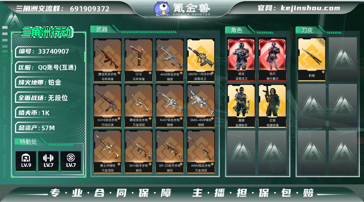 【S762】57m总资产-0k哈伏币-60烽火等级-铂金-1战场等级-无军衔 【干员外观】:骇爪-维什戴尔,威龙-凌霄戍卫,红狼-电锯惊魂,露娜-金牌射手 【近战皮肤】:近战-影锋,近战-黑鹰 【传说外观】:AKM突击步枪-锦绣,QBZ95-1突击步枪-凌霄戍卫,K416突击步枪-行动记录,SG552突击步枪-运动员,SCAR-H战斗步枪-启航,腾龙突击步枪-马年祥瑞,腾龙突击步枪-万金泪冠,K437突击步枪-锦绣,KC17突击步枪-电锯惊魂,SMG-45冲锋枪-锦绣,勇士冲锋枪-能天使-午夜邮差,勇士冲锋枪-万金泪冠,M14射手步枪-蛮荒,M14射手步枪-缄花,SR-25射手步枪-缄花,R93狙击步枪-维什戴尔,AWM狙击步枪-万金泪冠,.357左轮-缄花,G18-马年祥瑞 【史诗外观】:K416突击步枪-冬日风情,M7战斗步枪-百步穿杨,SG552突击步枪-深海恐惧,SG552突击步枪-哈夫克警备,G3战斗步枪-流沙送葬,AS Val突击步枪-百步穿杨,腾龙突击步枪-猎鳄行动,MP5冲锋枪-战术竞备,Vector冲锋枪-百步穿杨,Vector冲锋枪-异域战争,MP7冲锋枪-六套之力,M249轻机枪-丛影谍踪,QJB201轻机枪-炽焰,VSS射手步枪-丛影谍踪, M14射手步枪-航天庆典,SV-98狙击步枪-囚徒,M700狙击步枪-百步穿杨,AWM狙击步枪-流沙送葬 【稀有外观】...