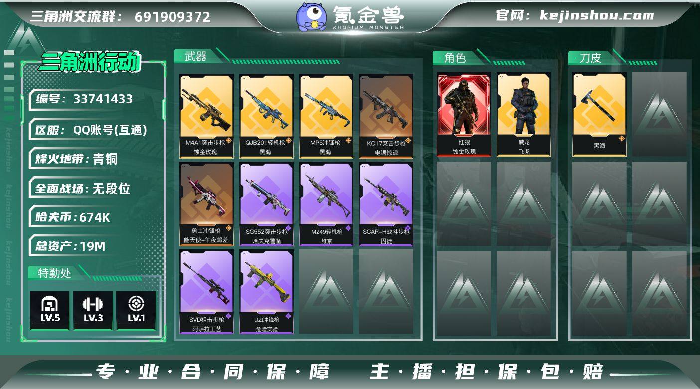 【960339】19m总资产-674k哈夫币-35烽火等级-青铜-1战场等级-无军衔 【干员外观】:红狼-蚀金玫瑰,威龙-飞虎 【近战皮肤】:近战-黑海,近战-黑鹰 【传说外观】:M4A1突击步枪-蚀金玫瑰,KC17突击步枪-电锯惊魂,MP5冲锋枪-黑海,勇士冲锋枪-能天使-午夜邮差,QJB201轻机枪-黑海 【史诗外观】:SG552突击步枪-哈夫克警备,SCAR-H战斗步枪-囚徒,UZI冲锋枪-危险实验,M249轻机枪-维京,SVD狙击步枪-阿萨拉工艺 【稀有外观】:M4A1突击步枪-夜幕,K416突击步枪-碳纤维,SG552突击步枪-2026,AK-12突击步枪-零点,SCAR-H战斗步枪-荣耀列队,G3战斗步枪-夜幕,CAR-15突击步枪-亚特兰蒂斯,腾龙突击步枪-冰天雪地,MP5冲锋枪-弄臣,Vector冲锋枪-先锋,UZI冲锋枪-亚特兰蒂斯,SMG-45冲锋枪-哈夫克卫队,SMG-45冲锋枪-幻影结构,勇士冲锋枪-冰天雪地,MP7冲锋枪-幻影结构,Mini-14射手步枪-荣耀列队,SVD狙击步枪-夜幕,M14射手步枪-哈夫克卫队,SR-25射手步枪-开拓,SV-98狙击步枪-星链科技,SV-98狙击步枪-哈夫克航天,SV-98狙击步枪-精英联盟,G18-星链科技,G18-哈夫克航天 【普通外观】:AKM突击步枪-淘金者,AK-12突击步枪-淘金者,S12K霰弹枪-淘金者,M16A4突击步枪-常青藤...