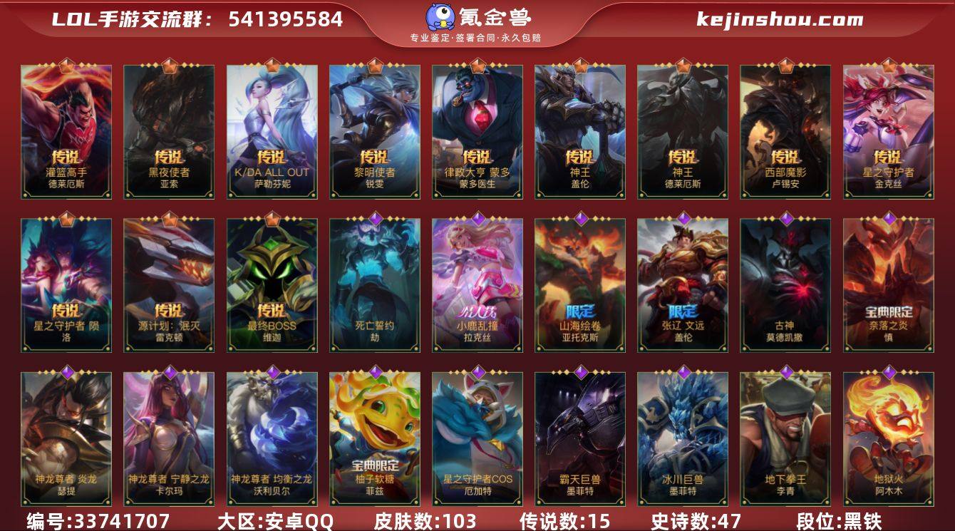 【LSC661】125英雄/103皮肤/1神话/15传说/47史诗/华贵铂金/天命豪侠 瑟提/张辽文远/山海绘卷剑魔/神王盖伦/海魔至尊 亚托克斯/星之守护者金克丝/K/DA ALLOUT萨勒芬妮/源计划:超体/黑夜使者亚索/西部魔影卢锡安/星之守护者 陨/霸天原祖 沃利贝尔/律政大亨/灌篮高手/神王诺手/黎明使者锐雯/源计划:泯灭/最终BOSS维迦/钢铁军团/张辽 文远/霸天剑魔亚托克斯/战斗学院拉克丝/小鹿乱撞拉克丝/地狱火阿木木/神龙尊者 宁静之龙 卡尔玛/野火首领 艾克/星之守护者发条/双城之战:天资 金克丝/末路管家/西部牛仔/K/DA ALL OUT卡莎/海之歌萨勒芬妮/古神 莫德凯撒/北极星使者 安妮/源计划:风/源计划:阴/死亡誓约劫/我,羽饰骑士 崔丝塔娜/驯龙女巫/银河魔装机神龙女/破败军团龙女/翼翼飞花 洛/欧米伽小队 毒针狙击手 图奇/神龙尊者 均衡之龙 沃利贝尔/泳池派对盲僧/地下拳王/魅惑女巫女枪/海之歌泽丽/神龙尊者 炎龙 瑟提/心之钢永恩/玉剑传说 无极/神龙尊者 苍龙/霸天巨兽石头人/冰川巨兽石头人/暗星墨菲特/虚空海灵/柚子软糖/灵魂莲华锐雯/地狱火加里奥/天启骑士/星之守护者COS厄加特/霸天战车螃蟹/奈落之炎 慎/鳄霸 雷克顿/欧米伽小队 天雷爆破手 维迦/s10王牌上将/S11王牌勇将/s13...