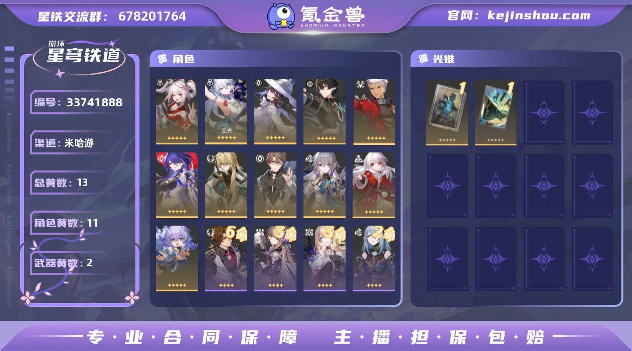 62级,女主,12黄,梦华0,星琼42,星轨专票2,星轨通票0,11个五星角色:火花,丹恒腾荒,大丽花,黄泉,爻光,布洛妮娅,罗刹,瓦尔特,白露,Archer,克拉拉,2个五星光锥:精1孤独的疗愈,精1星海巡航,服饰:雪绽梅笺