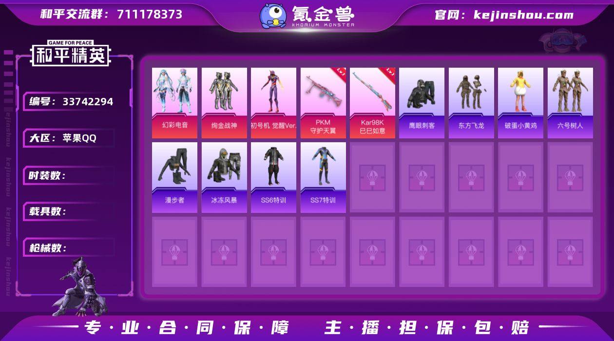 DSH2554【可二次】苹果手Q-3粉装-4特效枪-95套装-106枪皮-4王牌印记-不朽星钻Ⅲ-31893热力值【3粉装】绚金战神,幻彩电音,角色-初号机 觉醒Ver.【4特效枪】AKS-74U-森灵之息[5级],Mk14-福马献瑞[4级],Kar98K-巳巳如意[3级],PKM-守护天翼[6级]【2飞行器】马上有福飞行器,破刃行动尾迹【194其它衣服和枪皮】SS7特训,街头风暴,完美偶像,惊鸿侠骨,魅力单车,龙的传人,冷焰舞者,破晓战魂,鹰眼刺客,SS37特训,角色-阿虎,猎鹰,角色-Mark.06,雨过天青,旭日情侣,青玉碎影,红色运动,老实芭蕉,蓝色守护者,SS33特训,蓝彩潮人,SS25特训,橘黑制服,SS21特训,SS22特训,特训学院,街头潮人,破蛋小黄鸡,涂山之恋,SS34特训,冰冻风暴,战术大师,角色-奈斯,潮流炫酷,东方飞龙,白色伏地魔,漫步者,春光漫游,角色-X,SS36特训,马上来财,黄色名流,竞技名士,青年教官,深蓝色名流,燃烧卡路里,福马献瑞,竞技达人朋克,迎春赐吉,狙击之神,黑色伏地魔,快闪甜心,冰川特警,圣诞大吉,战地督导,绯格组合,六号树人,雪绒豹,蜜露汐语,雨林探路者,黄色伏地魔,锦衣飞扬,霓虹街区,SS26特训,云魄琉璃,耀眼新星,蓝色运动,猛禽,光之冒险,云朵鹅,日照花林,湖蓝色名流,SS29特训,都市魅力,雪山精英,SS24特训,云霞荷露,决胜时刻,疯狂小...