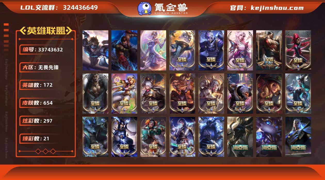 t40329【无畏先锋】654皮肤 297炫彩 21臻彩 33神话/84限定/76传说/172英雄 账号等级:812 单双排段位:钻石 【重要头像】至爱的鹿 银河魔装机神安妮 KDA萨勒芬妮 小茹 伊纳 幼犬沃里克 披萨鸡 送披萨的小姐姐希维尔 不错哦 【重要皮肤】永恒星灵佐伊至臻 莲华温泉厄斐琉斯至臻 灵魂莲华劫至臻 灵魂莲华拉克丝至臻 凯旋将军德莱厄斯至臻 黑色玫瑰假面舞会卡特琳娜至臻 狼神英灵斯维因至臻 心之钢永恩至臻 魂蔷薇烈娜塔至臻 DRX亚托克斯至臻 青花瓷丽桑卓至臻 北极星使者沃里克至臻 星之守护者辛德拉至臻 魅惑女巫莫甘娜至臻 女帝黛安娜至臻 源计划阴劫至臻 烈焰美人薇恩至臻 电玩女神凯特琳至臻 源计划正义艾瑞莉娅至臻 殿堂传奇薇恩 殿堂传奇乐芙兰 灰烬守护者慎 灰烬骑士莫德凯撒 灰烬骑士派克 海克斯科技斯维因 海克斯科技波比 幻灵战斗兔司令厄运小姐 水晶圣骑塔莉垭 零之枪骑赫卡里姆 胜利行刑官德莱文 胜利剑圣易 胜利女神娑娜 胜利女神希维尔 胜利之王泰达米尔 胜利巨口克格莫 创星之灵璐璐 荣誉使者玛尔扎哈 养蜂人辛吉德 安妮梦游仙境 玉剑传说无影 玉剑传说舞剑仙 女帝厄运小姐 女帝格温 玉剑传说舞龙卫 点心...