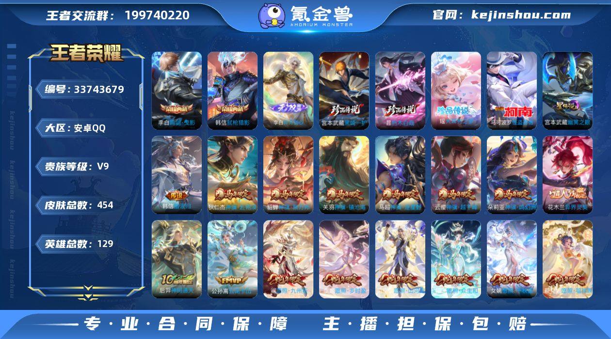 可换绑【极品v9推荐·马蛇年全套·韩信李白2典藏·李白无双·怪盗基德瑶·4珍品·鹤羽星尊·13w贵族积分】 2星传说 1天幕 24按键 276幸运值 12王者印记 270五级铭文 无二次安卓Q-V9-454皮肤-2典藏皮肤-1无双-4珍品传说-53传说-129史诗【英雄全皮】:刘禅全皮,达摩全皮,孙权全皮,苍全皮,鬼谷子全皮,敖隐全皮,蒙恬全皮,司空震全皮,戈娅全皮,空空儿全皮,影全皮【荣耀典藏】:李白鸣剑曳影,韩信弑枪猎影【无双皮肤】:李白碎月剑心【珍品传说】:宫本武藏黑崎一护,暃朽木白哉,瑶大耳狗之梦,马可波罗怪盗基德【星元皮肤】:刘备时之思念,宫本武藏幽冥之眼【天幕】:共赏芳华天幕【传说皮肤】:韩信踏浪归,云缨神骥越千峰,关羽神骥镇沧海,朵莉亚神骥鸣幻洲,狄仁杰神骥赴朔漠,貂蝉神骥聚万邦,马超神骥逐星野,花木兰异界灵契,后羿神树通天,公孙离云诺千山,西施续相思,杨玉环星之鸣奏,后羿千劫归真,司空震愿照山河定,女娲愿照千秋盛,妲己愿照众生和,澜愿照九州拓,蔡文姬愿照福禄聚,虞姬愿照岁时盈,云缨幻光神枪,裴擒虎祥瑞亨通,桑启鸣野蒿,吕布曦玄引,典韦战鼓燎原,孙策乘龙淬吴钩,赵云乘龙铭钟鼎,甄姬至美化雀舞,东皇太一灼幽烈阳,诸葛亮鹤羽星尊...