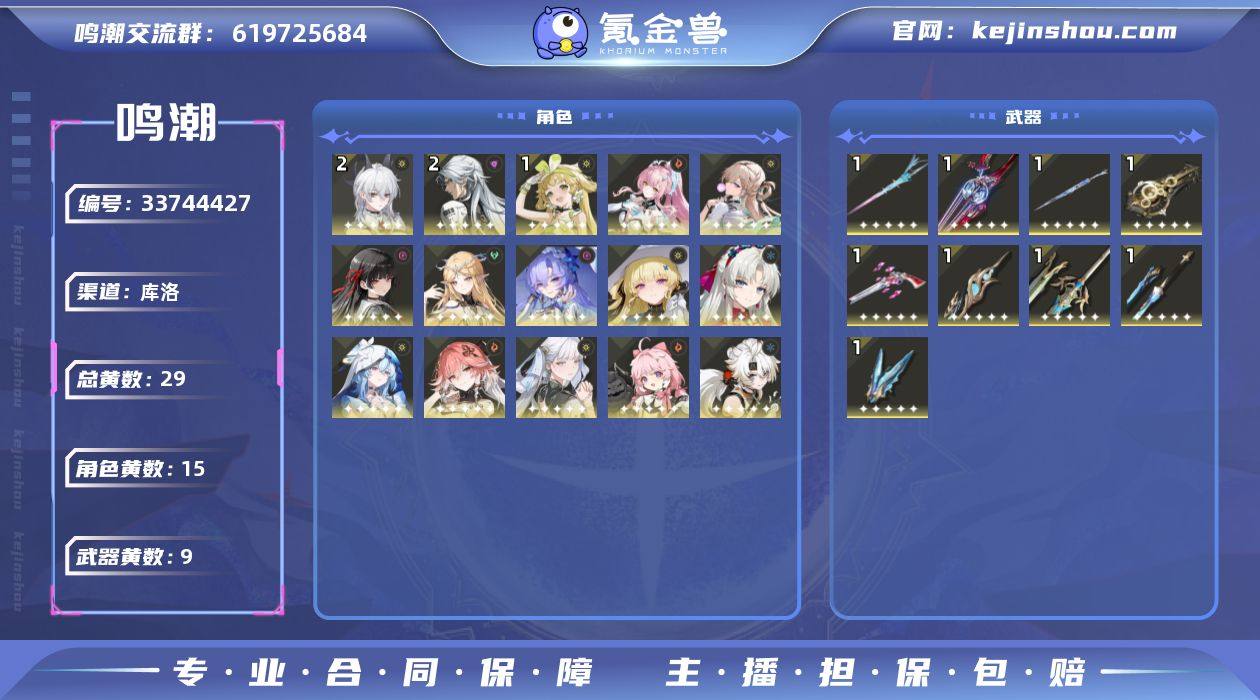 男/女主: 男主 总黄数: 29 联觉等级: 70 拥有五星共鸣者: 卡卡罗,安可,维里奈,凌阳,今汐,长离,守岸人,珂莱塔,菲比,坎特蕾拉,赞妮,卡提希娅,千咲,琳奈,爱弥斯 2鸣五星共鸣者: 2鸣卡卡罗,2鸣赞妮 1鸣五星共鸣者: 1鸣维里奈 0鸣五星共鸣者: 0鸣安可,0鸣凌阳,0鸣今汐,0鸣长离,0鸣守岸人,0鸣珂莱塔,0鸣菲比,0鸣坎特蕾拉,0鸣卡提希娅,0鸣千咲,0鸣琳奈,0鸣爱弥斯 拥有五星武器: 千古洑流,擎渊怒涛,时和岁稔,死与舞,血誓盟约,焰光裁定,不屈命定之冠,昙切,永远的启明星 1鸣五星武器: 1鸣千古洑流,1鸣擎渊怒涛,1鸣时和岁稔,1鸣死与舞,1鸣血誓盟约,1鸣焰光裁定,1鸣不屈命定之冠,1鸣昙切,1鸣永远的启明星 亮点: 【MC339】70级/29黄/男主/15个五星角色/9个五星武器未绑定,爱弥斯,赞妮,卡提希娅,千咲,琳奈,菲比,坎特蕾拉,今汐,珂莱塔,长离,守岸人,维里奈,卡卡罗,安可,凌阳,永远的启明星,昙切,不屈命定之冠,焰光裁定,血誓盟约,死与舞,时和岁稔,千古洑流,擎渊怒涛,2命赞妮,2命卡卡罗,1命维里奈,0命爱弥斯,0命卡提希娅,0命千咲,0命琳奈,0命菲比,0命坎特蕾拉,0命今汐,0命珂莱塔,0命长离,0命守岸人,0命安可,0命凌阳,精1永远的启明星,精1昙切,精1不屈命定之冠,精1焰光裁定,精1血誓盟约,精1死与舞,...