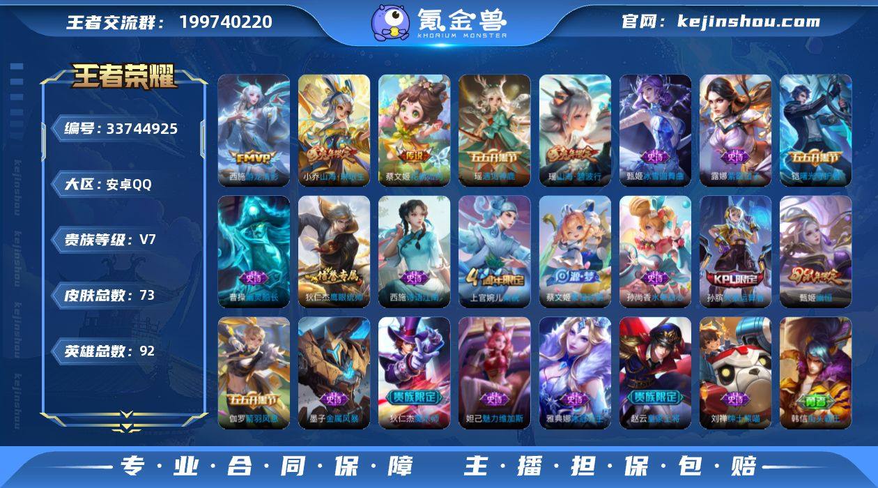 实名: 可修改 性别: 男号 贵族等级: V7 英雄数: 92 皮肤数: 73 传说皮: 游龙清影,花朝如约,山海·琳琅生 限定皮: 梁祝,幽恒,天狼运算者,山海·碧波行 亮点: 【优质装备】:游龙清影(小青龙),花朝如约(花篮子),山海·琳琅生(小乔年限)