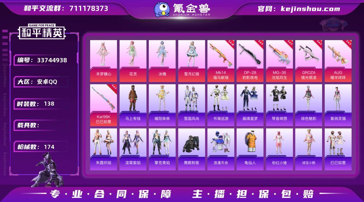 【kyhp1618】安卓 手Q-4粉装-6特效枪-0载具-2粉色飞行器-46511热力值-8王牌印记-138套装-174枪皮 【热门品类】:套装-浪漫天命,套装-龟仙人,套装-粉红小猪 【粉色套装】:粉装-雪月幻音,角色-花灵,角色-冰魄,角色-羊梦糖心 【粉色枪皮等级】:GROZA-镜光银凌(一级),AUG-暖羊咩咩(一级),Kar98K-巳巳如意(一级),Mk14-福马献瑞(三级),DP-28-豹影疾电(一级),MG-36-沧焰双生(一级) 【粉色枪皮】:GROZA-镜光银凌,AUG-暖羊咩咩,Kar98K-巳巳如意,Mk14-福马献瑞,DP-28-豹影疾电,MG-36-沧焰双生 【粉色飞行器】:炫彩糖果飞行器,时光之吻飞行器 【粉色降落伞】:第五大道降落伞,忍者神龟降落伞,千金淑猫降落伞,星穹咏叹调降落伞,幻彩电音降落伞,时光之吻降落伞,冷漠罗丽降落伞,喜羊羊与灰太狼降落伞,异瞳寒姬降落伞,炫彩糖果降落伞 【稀有套装】:套装-龟仙人,套装-绒宝小鹅,套装-巳巳如意,套装-兰香蝶语,套装-雪国风尚,套装-炫彩糖果,套装-马上有钱,套装-雏菊兔兔,套装-萝兰蝴蝶,套装-小熊娃娃,套装-游龙飞鱼,套装-糖糖葫芦,套装-青团波波,套装-棉花软糖,角色-都市丽猫,套装-燕燕于飞,套装-鱼渊荷华,套装-樱梦幻音,套装-粉恋花,套装-紫幽...