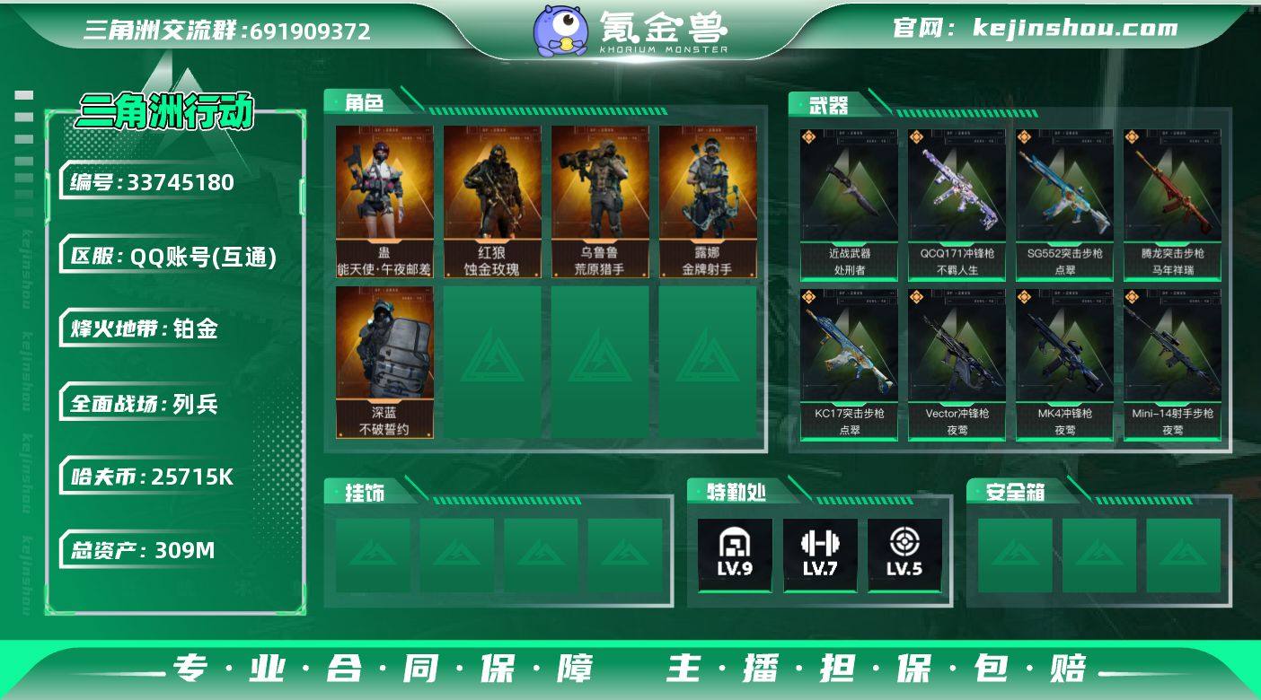 编号A01505 不可二次 等级60 总资产309.3M 流动资产3249.2M 哈夫币25715K 1刀 2红皮 基础安全箱 仓库lv9 训练中心lv7 靶场lv6 处刑者 蚀金玫瑰 午夜邮差