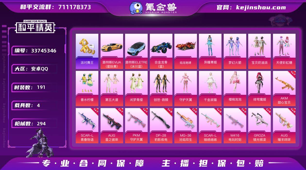 【kyhp1629】安卓 手Q-12粉装-15特效枪-4载具-2粉色飞行器-99442热力值-18王牌印记-191套装-294枪皮 【热门品类】:粉装-梦幻火箭,套装-派对舞王,套装-龟仙人,套装-暗影哥特,套装-红熊茄茄 【粉色套装】:粉装-宝贝奶油派,粉装-天使彩虹糖,粉装-梦幻火箭,粉装-香水柠檬,粉装-第五大道,粉装-闲梦青缨,套装-创世·救赎,角色-守护天翼,角色-千金淑猫,角色-樱桃泡泡,角色-绯穹魔姬,角色-异瞳寒姬 【粉色枪皮等级】:AKM-甜心宝贝(七级),SCAR-L-青春物语(七级),SCAR-L-锦绣绵绵(五级),M416-电玩时刻(五级),GROZA-镜光银凌(五级),AUG-星之彼岸(七级),AUG-暖羊咩咩(五级),M762-青锋波束(五级),UMP45-量子极限(五级),汤姆逊-热量炸弹(五级),Kar98K-巳巳如意(五级),Mk14-甜梦熊击(五级),DP-28-豹影疾电(五级),PKM-守护天翼(七级),MG-36-沧焰双生(五级) 【粉色载具】:路特斯EVIJA(星际黄),路特斯ELETRE(冰川蓝),合金龙骨(蓝),焰龙咆哮 【粉色枪皮】:AKM-甜心宝贝,SCAR-L-青春物语,SCAR-L-锦绣绵绵,M416-电玩时刻,GROZA-镜光银凌,AUG-星之彼岸,AUG-暖羊咩咩,M762-青锋波束,UMP45-量子极限,汤姆逊-热量炸弹,Kar98K-巳巳如意,Mk14-甜梦...