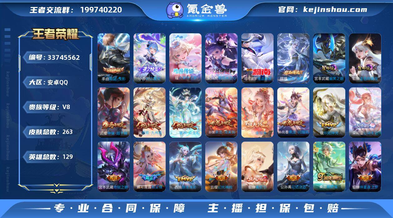 【店长精选女号·嫦娥全皮·西施全皮·少司缘全皮·时之魔女·酷洛米之心·大耳狗之梦·器灵落星盏·怪盗基德·神骥越千峰·续相思·愿照众生和·映山客·朵莉亚心动手记·曦玄引·乘龙问璇玑·前尘镜·乘龙淬吴钩·灼幽烈阳·音你闪耀·游龙清影·炽阳神光·启明星使·猫影幻舞·仲夏夜之梦·山海碧波行·寅虎心曲·乘龙忆丹青·至美乘鲤谣·可二次】YXw25879-安卓Q-129英雄-263皮肤-10王者印记-185铭文-贵族积分7w【贵族8】【1典藏·1无双·4珍品·2星传说·22传说·15按键·248幸运值】【因赛季更新游戏段付以上号为准!】 【英雄全皮】:孙权全皮,娜可露露全皮,嫦娥全皮,敖隐全皮,西施全皮,戈娅全皮,空空儿全皮,少司缘全皮 【荣耀典藏】:李白鸣剑曳影 【无双皮肤】:小乔时之魔女 【珍品传说】:安琪拉酷洛米之心,瑶大耳狗之梦,嫦娥器灵落星盏,马可波罗怪盗基德 【星元皮肤】:宫本武藏幽冥之眼,貂蝉金色仲夏夜 【传说皮肤】:云缨神骥越千峰,西施续相思,妲己愿照众生和,澜愿照九州拓,云缨幻光神枪,王昭君映山客,桑启鸣野蒿,朵莉亚心动手记,貂蝉曦玄引,孙尚香乘龙问璇玑,孙策乘龙淬吴钩,东皇太一灼幽烈阳,公孙离记忆之芯,娜可露露前尘镜,孙尚香音你闪耀,西施游龙清影,周瑜音你心动...