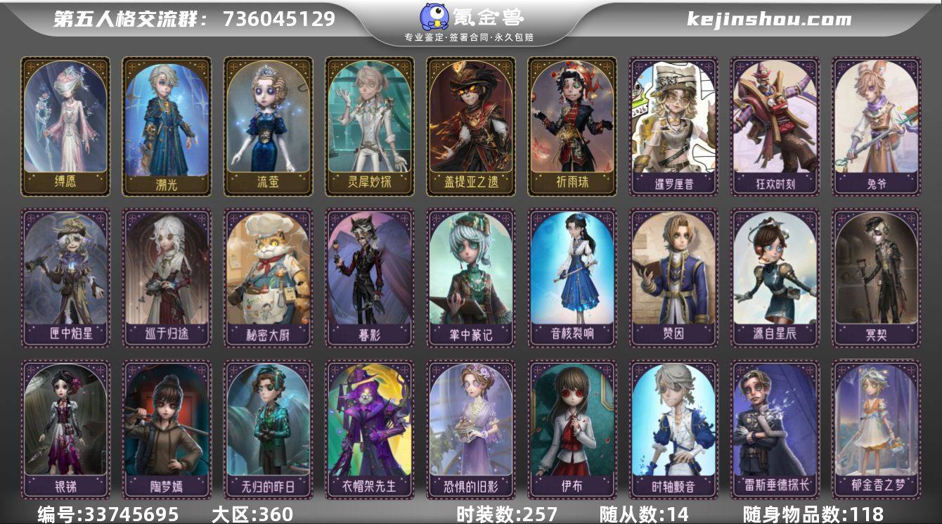 自用号,账号无违规,无风险,可换绑,各类皮肤、随身物品、随从及资产丰富,有26310水晶碎片,22673线索,4张紫皮解锁卡和4张蓝皮解锁卡,求生者目前全角色,监管者角色也有一些。