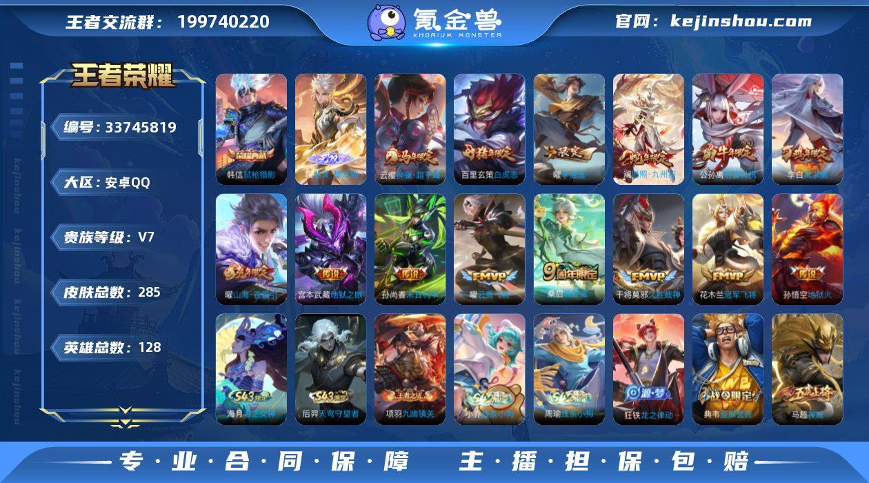 安卓Q-V7-最强王者段位-128英雄-285皮肤-1典藏皮肤-1无双-14传说-72史诗 【英雄全皮】:孙权全皮,敖隐全皮,曜全皮,影全皮 【荣耀典藏】:韩信弑枪猎影 【无双皮肤】:曜器灵螭龙剑 【传说皮肤】:云缨神骥越千峰,澜愿照九州拓,桑启鸣野蒿,曜山海苍雷引,曜李逍遥 ,公孙离祈雪灵祝,曜云鹰飞将,干将莫邪久胜战神,百里玄策白虎志,花木兰冠军飞将,李白凤求凰,孙尚香末日机甲,宫本武藏地狱之眼,孙悟空地狱火 【限定皮肤】:白起狰,暃埋骨钱,姜子牙天穹之誓,狄仁杰阴阳师,虞姬凯尔特女王,赵云皇家上将,嬴政白昼王子,孙尚香蔷薇恋人,鲁班七号狮舞东方,芈月重明,吕布猎兽之王,周瑜赤莲之焰,元歌云间偶戏,元歌无心,夏侯惇朔风刀,曹操烛龙,典韦穷奇,典韦蓝屏警告,马可波罗暗影游猎,狄仁杰魔术师,狄仁杰万华元夜,达摩沙漠行僧,项羽海滩派对,老夫子醍醐杖,程咬金演武夺筹,韩信飞衡,韩信傲雪梅枪,兰陵王驯魔猎人,兰陵王金庭之子,花木兰瑞麟志,亚瑟潮玩骑士王,孙悟空大圣娶亲,牛魔御旌,后羿辉光之辰,李元芳银河之约,李元芳云中旅人,钟馗神迹守卫,钟馗驱傩正仪,杨玉环遇见飞天,女娲朔望之晖,干将莫邪胡桃夹子,雅典娜黎明之约,蔡文...