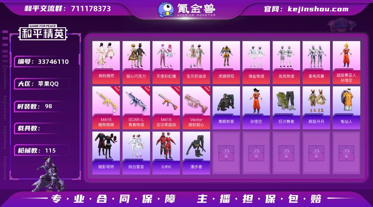 苹果 手Q【无敌战神框 巧克力三姐妹猪脸黄螳螂梦幻火箭红熊茄茄】无敌战神框-12粉装-4特效枪-0载具-1粉色飞行器-41415热力值-10王牌印记-98套装-115枪皮 【热门品类】:粉装-梦幻火箭,粉装-缤纷油彩,套装-龟仙人,套装-暗影哥特,套装-红熊茄茄 【粉色套装】:粉装-甜心巧克力,粉装-宝贝奶油派,粉装-天使彩虹糖,粉装-梦幻火箭,粉装-缤纷油彩,粉装-虎啸骄阳,角色-零号机款机体服,粉装-岚岚物语,粉装-海盐物语,粉装-紫电风暴,粉装-飒粉甜心,粉装-桃粉嫣然 【粉色枪皮等级】:SCAR-L-青春物语(六级),M416-暖熊萌萌(五级),M416-全功率超战(四级),Vector-飒粉甜心(四级) 【粉色枪皮】:SCAR-L-青春物语,M416-暖熊萌萌,M416-全功率超战,Vector-飒粉甜心 【粉色飞行器】:暖熊萌萌飞行器 【粉色降落伞】:甜心宝贝降落伞,梦幻火箭降落伞,蓝莓炮弹降落伞,碧影闪光降落伞,圣光天使降落伞,暖熊萌萌降落伞,旋转彩虹降落伞,第五大道降落伞,龙珠超降落伞,飒粉甜心降落伞,南国舞曲降落伞,未来歌姬降落伞,粉樱探戈降落伞,拂晓神骑降落伞,幻彩电音降落伞 【稀有套装】:套装-龟仙人,套装-遗迹猎人,角色-乐音 【稀有枪皮】:AKM-奇异狩猎者,AKM-影袭,M16A...