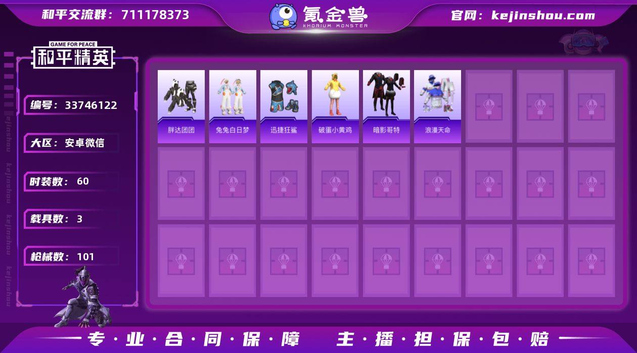 安卓 微信-2粉装-8特效枪-3载具-2粉色飞行器-28555热力值-4王牌印记-60套装-101枪皮 【热门品类】:粉装-梦幻火箭,套装-浪漫天命,套装-胖达团团,套装-潮萌小黄鸭,套装-暗影哥特,熔岩游骑兵连帽夹克 【粉色套装】:粉装-梦幻火箭,角色-鸢尾珑雾 【粉色枪皮等级】:ACE32-萌骑漫游(一级),UMP45-萌骑冒险(一级),AKS-74U-森灵之息(五级),Mk14-福马献瑞(五级),AA12-G-萌骑幻想(三级),DP-28-豹影疾电(五级),PKM-萌骑夺宝(一级),MG-36-沧焰双生(五级) 【粉色载具】:法拉利LaFerrari(赛车红),九霄玄鹿,霜月冰狼 【粉色枪皮】:ACE32-萌骑漫游,UMP45-萌骑冒险,AKS-74U-森灵之息,Mk14-福马献瑞,AA12-G-萌骑幻想,DP-28-豹影疾电,PKM-萌骑夺宝,MG-36-沧焰双生 【粉色飞行器】:炫彩糖果飞行器,冰狼掠影飞行器 【粉色降落伞】:甜心宝贝降落伞,梦幻火箭降落伞,洛神天依降落伞,炫彩糖果降落伞,霜月狼主降落伞 【稀有套装】:角色-甜心蒙太奇,套装-荧光像素,套装-雪国风尚,套装-炫彩糖果,套装-迅捷龙虾,套装-朱霞炽焰,套装-凌霄紫焰,玩偶服-喜羊羊,角色-绯色魅影,套装-书海巡游,套装-画境星梦,套装-琴音绮想,套装-雨过天青,套装-红釉青花,角色-...