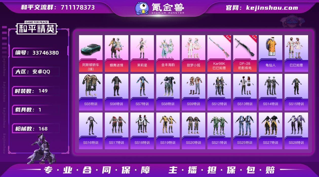 编号89405 不可二次 等级68 149套装 168枪皮 8王牌印记 热力值54038 0红装 1载具 4粉 2特效枪 阿斯顿·马丁DBS(绿) 1级DP-28-豹影疾电 2级Kar98K-巳巳如意 金丰海韵 茉莉星 甜梦小狐 蝶舞迷情 雪山精英 套装-青春冒险家 套装-俏皮奶喵 套装-无暇誓言 套装-粉日山川 SCAR-L-暗夜玫瑰 套装-曜粉歌者 套装-暴风机甲 9粉降落伞 1粉滑翔尾翼