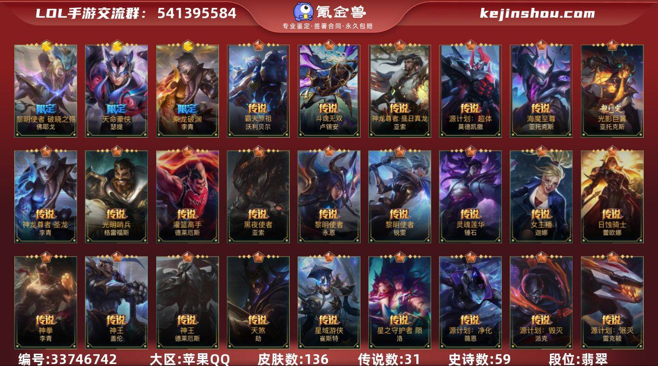 实名: 可修改 段位: 翡翠 皮肤数: 136 神话皮: 乘龙破渊 李青,天命豪侠 瑟提,黎明使者 破晓之殇 佛耶戈 限定皮肤: 山海绘卷狗熊 传说皮: 灌篮高手,黑夜使者亚索,黎明使者锐雯,女主播风女,日蚀骑士蕾欧娜,神拳盲僧,神王盖伦,神王诺手,天煞劫,星域游侠卡牌,星之守护者 陨,源计划:净化,月蚀骑士蕾欧娜,战斗学院ez,灵魂莲华锤石,黎明使者永恩,源计划:林,源计划:泯灭,光明哨兵格雷福斯,跳跳倩影女枪,斗魂无双亚索,灵魂莲华腕豪,心之钢凯隐,源计划:毁灭,光影巨翼亚托克斯,神龙尊者 圣龙 李青,海魔至尊 亚托克斯,源计划:超体,神龙尊者 昼日真龙 亚索,斗魂无双 卢锡安,霸天原祖 沃利贝尔 亮点: 【优质装备】:灌篮高手,黑夜使者亚索,黎明使者锐雯,女主播风女,日蚀骑士蕾欧娜,神拳盲僧,神王盖伦,神王诺手,天煞劫,星域游侠卡牌,星之守护者 陨,源计划:净化,月蚀骑士蕾欧娜,战斗学院ez,玉剑传说 武剑仙,灵魂莲华锤石,源计划:林,源计划:泯灭,光明哨兵格雷福斯,跳跳倩影女枪,灵魂莲华腕豪,心之钢凯隐