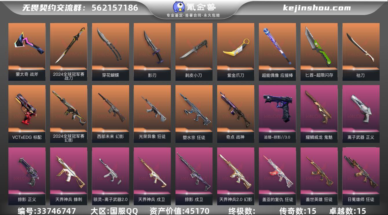皮肤总价值45170,绝版24冠军套,黄金I段,账号安全可换绑 皮肤82款,刀皮10把,枪皮72把(传奇6,卓越15) 套装2套(传奇1,卓越1),2024全球冠军赛、掠影、剥皮小刀、紫金爪刀、穿花蝴蝶、塑水都有 连体一个王者荣耀贵5的号 具体皮肤详情看图,喜欢直接拍,