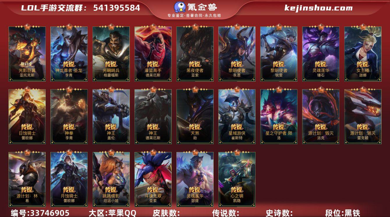 3神话 1限定 31传说 59史诗 136皮肤 可二次 可修改实名 信誉分低于350 【段位】翡翠 【神话皮】黎明使者 破晓之殇 佛耶戈,天命豪侠 瑟提,乘龙破渊 李青 【限定皮肤】山海绘卷狗熊 【传说皮】神龙尊者 圣龙 李青,海魔至尊 亚托克斯,光影巨翼亚托克斯,源计划:毁灭,灵魂莲华腕豪,霸天原祖 沃利贝尔,斗魂无双 卢锡安,神龙尊者 昼日真龙 亚索,源计划:超体,心之钢凯隐,星域游侠卡牌,天煞劫,神王诺手,神王盖伦,神拳盲僧,日蚀骑士蕾欧娜,女主播风女,黎明使者锐雯,黑夜使者亚索,灌篮高手,源计划:泯灭,斗魂无双亚索,跳跳倩影女枪,光明哨兵格雷福斯,源计划:林,黎明使者永恩,灵魂莲华锤石,战斗学院ez,月蚀骑士蕾欧娜,源计划