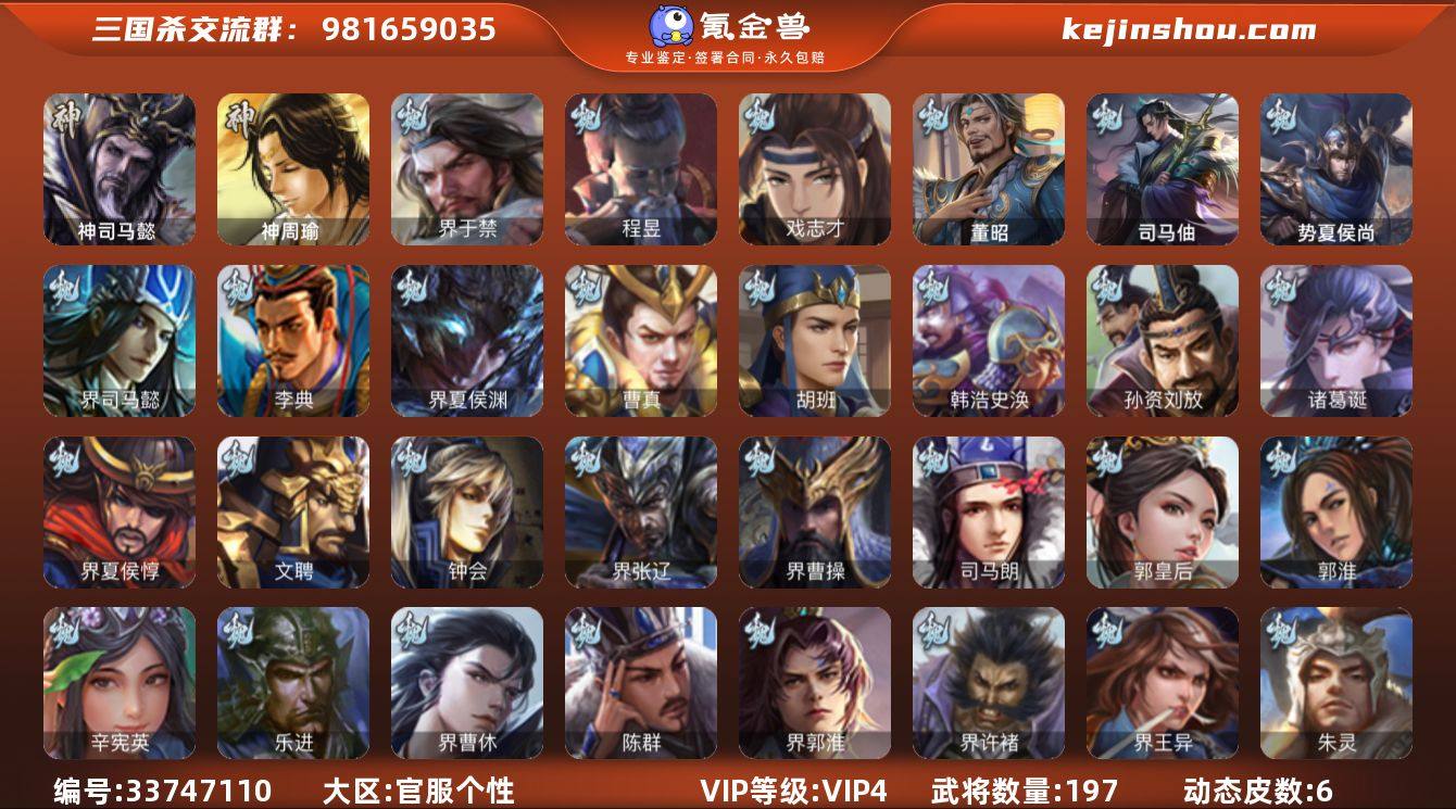 【14790346】官阶:中军将军;VIP等级:VIP4;史诗武将数量:7;动态皮肤数量:6;武将总数:197;史诗宝珠数量:6;将魂数量:3377;神将:1;魏国史诗武将:2;蜀国史诗武将:0;吴国史诗武将:1;群史诗武将:2