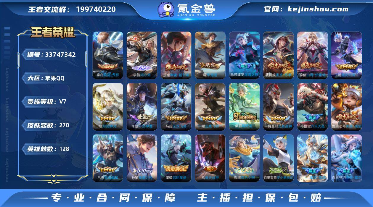 实名: 可修改 性别: 男号 贵族等级: V7 英雄数: 128 皮肤数: 270 荣耀水晶: 鸣剑·曳影 无双皮: 问心剑 传说皮: 云鹰飞将,绛天战甲,久胜战神,炽阳神光,一念神魔,李逍遥,挚爱之约,无双飞将,山海·炽霜斩,澜逐花归海,神骥·越千峰 限定皮: 李小龙,梁祝,朱雀志,至尊宝,一生所爱,寅虎·瑞焰,高山流水,傲雪梅枪,寅虎·赤拳,百木心枪,深海之息,怒海麟威,齐天大圣,鸣野蒿,逐霄战戟 亮点: 【优质装备】:鸣剑·曳影,云鹰飞将(小将军),绛天战甲(鸡嘴战神),久胜战神,炽阳神光,一念神魔,李逍遥,挚爱之约,无双飞将,山海·炽霜斩(李信年限),澜逐花归海,问心剑