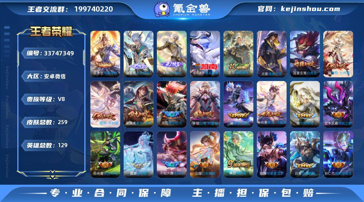 实名: 可修改 性别: 男号 贵族等级: V8 英雄数: 129 皮肤数: 259 荣耀水晶: 九霄神辉 无双皮: 碎月剑心,天机白泽 珍品传说: 怪盗基德 传说皮: 炽阳神光,末日机甲-孙尚香,仲夏夜之梦,地狱之眼,超时空战士-狄仁杰,山海·炽霜斩,霜月吟,澜逐花归海,琥珀纪元马超,乘龙·问璇玑,幻光神枪,诡秘之主,神树通天 限定皮: 梁祝,蜜橘之夏,飞衡,白虎志,至尊宝,寅虎·赤拳,绯月行,怒海麟威,山海·玄木吟,山海·碧波行,鸣野蒿,逐霄战戟,愿照·岁时盈,愿照·九州拓 亮点: 【优质装备】:九霄神辉(木兰典藏),碎月剑心(李白无双),天机白泽,怪盗基德,炽阳神光,末日机甲-孙尚香(绿蚂蚱),仲夏夜之梦(大飞蛾),地狱之眼,超时空战士-狄仁杰,山海·炽霜斩(李信年限),霜月吟,澜逐花归海,琥珀纪元马超,诡秘之主,涂山容容