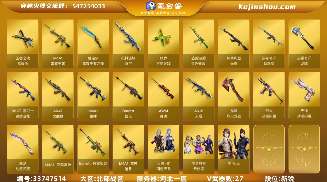 【ky7110】河北一区-33V-6王者武器数-0炫金武器数 【热门武器】:金色蔷薇-古蛇迷踪,修罗-古蛇迷踪 【王者炫金武器】:M4A1-雷霆王者,雷霆王者之锋,高爆手雷-雷霆王者*2 【音效卡】:屠龙-电竞之星-竞星跃动音效卡,HK417-朱雀-电竞之星-竞星跃动音效卡,Barrett-碧霄极光音效卡 【皮肤】:雷神-暗月,雷神-化蛇 皮肤,火麒麟-斗烈龙驹 皮肤,屠龙-破浪逐光 皮肤 【角色】:电竞教官-云悠悠,零·纪元,太空指挥官,不败狙神,王者-零-国色天香,蛇隐宗,奇洋探员,乔伊教练,修道士,云海玲珑,幻面灵狐,斗烈龙骑,暗夜-X,北极狐-X,电竞少女,芳心审判者,飞虎队-X,风暴女,虎妞,嘉年华灵狐,兰-空鹰,猎狐者-追月,灵狐-花神,灵狐者-X,龙儿,曼陀罗-X,玫瑰花神,萌儿,潘多拉-X,潘多拉-甜心教官,青霞仙子,蛇姬,蜀雪,兔囡囡,维纳斯,夜玫瑰-宠粉,樱-战斗天使,游珑儿,潘多拉-N,团团 【人偶武器】:天龙-曼陀罗,AWM-灵狐-15周年嘉年华,迷你牛魔王,迷你波特博士,夺魂,迷你牛牛,深渊终结者手雷,迷你巨石泰坦-魔花研究所,灵狐娃娃手雷 【暴走生化】:双面神-竞魂*2,超级对讲机 【挑战大师】:神圣爆裂者-末日III 【英雄级武器】:AK47-火麒麟,M4A1-...