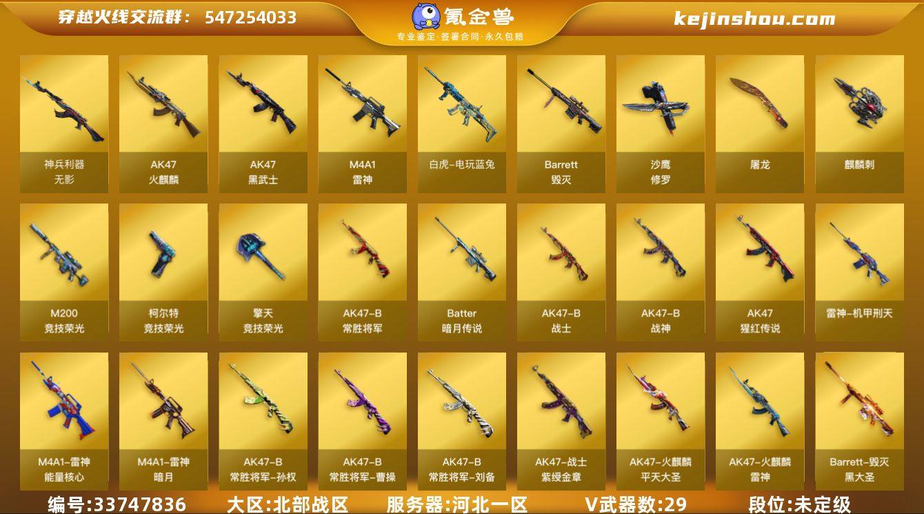 河北一区-33V-0王者武器数-0炫金武器数 【传说角色】:传说女帝 【热门武器】:M200-竞技荣光*2,白虎-电玩蓝兔,沙鹰-修罗*2,金刚伞 【音效卡】:M4A1-雷神音效卡,Barrett-毁灭音效卡 【皮肤】:雷神-暗月,雷神-能量核心,雷神-机甲刑天皮肤,雷神-宇航兔皮肤,火麒麟-雷神,火麒麟-平天大圣,毁灭-黑大圣皮肤,毁灭-英雄计划 皮肤,战神-紫绶金章皮肤,AK47-B-常胜将军-曹操,AK47-B-常胜将军-刘备*2,AK47-B-常胜将军-孙权*2,修罗-能量核心,屠龙-破浪逐光 皮肤 【角色】:葵,王者-葵-貂蝉,王者之瞳,芳心审判者,嘉年华灵狐,娟娟,零-水下丽影,灵狐者-黄金海岸,麻雀,曼陀罗-X,潘多拉-X,潜龙队-X,斯沃特-X,甜心偶像,兔囡囡,新娜塔莎,影武者-X,团团 【人偶武器】:AWM-灵狐-15周年嘉年华,迷你牛魔王,闪光弹-貂蝉,高爆手雷-大乔,迷你超能女侍,灵狐娃娃手雷*2 【挑战大师】:神圣爆裂者-末日III*2 【英雄级武器】:AK47-火麒麟,M4A1-雷神,AK47-黑武士,无影-神兵利器,AK-47-猩红传说*2,AK47-B-战神,AK47-B-常胜将军,白虎-电玩蓝兔,AK47-B-身先士卒,AK47-B-战士,Barrett-毁灭,M200-竞技荣光*2,Barrett-暗月传说,沙鹰-修罗*2,柯尔特-竞技荣...