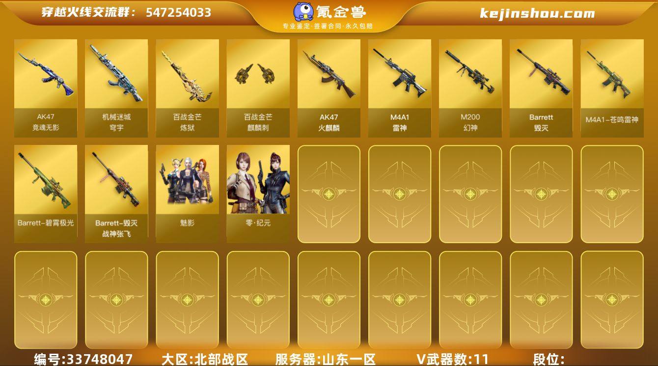 北部战区(山东一区)ys【幻神小号】11v【M200-幻神,AK47-火麒麟,M4A1-雷神,机械迷城-穹宇,Barrett-毁灭,炼狱-百战金芒,麒麟刺-百战金芒,异变清道夫-蛇影双骄,玄豹雷一套】3角色【魅影,零·纪元,葵-阿尔法武装】1音效【炼狱-百战金芒-庆典舞曲音效卡】3皮肤【毁灭-战神张飞,M4A1-战神赵云,毁灭-英雄计划】 截图展示段位不代表实际段位 如赛季更新等不可抗拒因素发生变化、时限道具不保证所剩时间