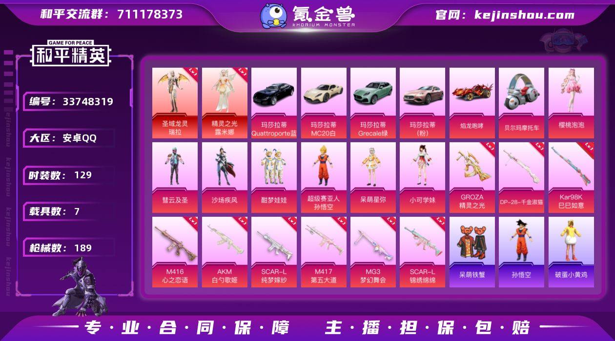 安卓 手Q【五级露米娜 一级瑞拉 樱桃泡泡荧海星豚深海小丑鱼 7载具1僚机】2神装-11粉装-11特效枪-7载具-6粉色飞行器-79983热力值-10王牌印记-129套装-189枪皮 【红色神装等级】:圣域龙灵-瑞拉(一级),精灵之光-露米娜(五级) 【红色角色神装】:圣域龙灵-瑞拉,精灵之光-露米娜 【热门品类】:套装-深海小丑鱼,套装-小丑鱼,套装-龟仙人,角色-8号机,角色-Mark.06 【粉色载具】:玛莎拉蒂MC20(星石白),玛莎拉蒂Quattroporte(夜幕蓝),玛莎拉蒂Ghibli(粉),玛莎拉蒂Grecale(薄荷绿),迈凯伦570S(天际蓝),焰龙咆哮,布尔玛摩托车,僚机-圣域龙宝 【粉色套装】:粉装-彗云及圣,粉装-沙场疾风,粉装-酣梦娃娃,粉装-恐龙拽拽,粉装-暗夜鎏金,超级赛亚人-孙悟空,角色-呆萌星弥,角色-小可学妹,粉装-闲梦青缨,角色-樱桃泡泡,角色-荧海星豚 【粉色枪皮等级】:AKM-白勺歌姬(四级),SCAR-L-纯梦嫁纱(四级),SCAR-L-锦绣绵绵(五级),M416-心之恋语(五级),GROZA-精灵之光(三级),Kar98K-巳巳如意(五级),Kar98K-圣域龙灵(三级),M417-第五大道(四级),DP-28-千金淑猫(二级),DP-28-豹影疾电(五级),MG3-梦幻舞会(四级) 【粉色枪皮】:AKM-白勺歌姬,SCAR-L-纯梦嫁...