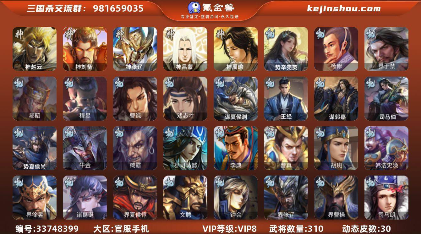 玉龙马良,张奋,辛宪英,陆郁生加动皮,及宇宙兄弟,大宝,势太,张绣,友徐庶,谋黄月英,有年卡等等。鄙人正直,从未骗人,买到后哪怕不改密码,也绝无被找回的可能。请相信,绝不亏。