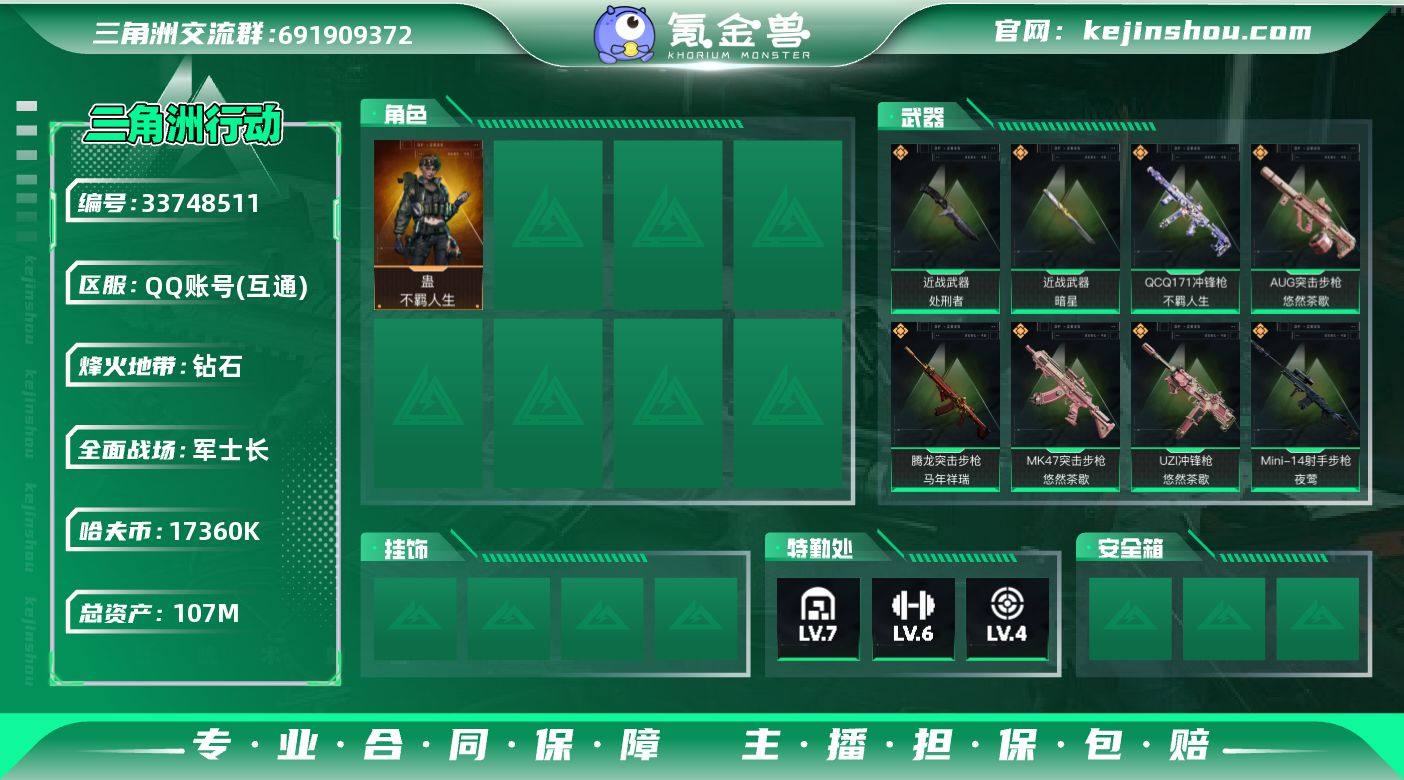 【960514】107m总资产-17360k哈夫币-60烽火等级-钻石-40战场等级-军士长 【干员外观】:蛊-不羁人生 【近战皮肤】:近战-暗星,近战-处刑者1级,近战-黑鹰 【传说外观】:QBZ95-1突击步枪-凌霄戍卫,AUG突击步枪-悠然茶歇,腾龙突击步枪-马年祥瑞,腾龙突击步枪-万金泪冠,MK47突击步枪-悠然茶歇,MK47突击步枪-暗星,UZI冲锋枪-悠然茶歇,SR-3M紧凑突击步枪-暗星,勇士冲锋枪-万金泪冠,QCQ171冲锋枪-不羁人生,Mini-14射手步枪-夜莺,M14射手步枪-缄花,AWM狙击步枪-万金泪冠,G18-马年祥瑞 【史诗外观】:ASh-12战斗步枪-碎冰行动,K416突击步枪-冬日风情,K416突击步枪-阿萨拉特攻,K416突击步枪-缄默情歌,AUG突击步枪-蝮蛇,腾龙突击步枪-猎鳄行动,MP5冲锋枪-深海恐惧,MP5冲锋枪-竞技风,MP7冲锋枪-六套之力,PKM通用机枪-阿萨拉特攻,M250通用机枪-囚徒,QJB201轻机枪-炽焰,M14射手步枪-工业狂潮,M700狙击步枪-竞技风 【稀有外观】:AKS-74U突击步枪-休闲时光,AKM突击步枪-肃杀,K416突击步枪-一帆风顺,AUG突击步枪-前沿科技,SG552突击步枪-贴花艺术, AK-12突击步枪-马年新春,MP5冲锋枪-弄臣,MP5冲锋枪-哈夫克卫队,P90冲锋枪-贴花艺术,Vector冲锋枪-先锋,...