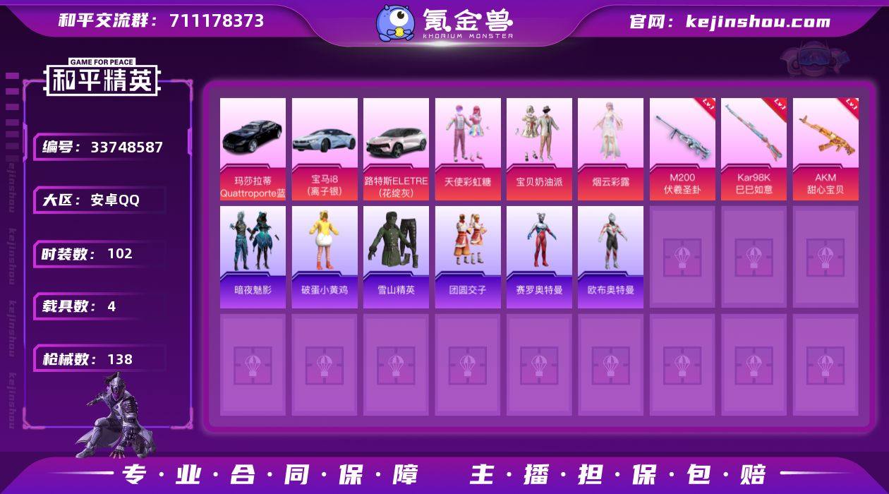 安卓 手Q【14印记 宝贝奶油派 天使彩虹糖 仲夏莫吉托 女娲灵识 美羊羊 满级甜心宝贝AKM 满级伏羲圣卦M200 4载具】6粉装-5特效枪-4载具-5粉色飞行器-51104热力值-14王牌印记-102套装-138枪皮 【粉色套装】:粉装-宝贝奶油派,粉装-天使彩虹糖,粉装-仲夏莫吉托,角色-烟云彩露,角色-女娲灵识,角色-绯穹魔姬 【粉色枪皮等级】:AKM-甜心宝贝(七级),Kar98K-巳巳如意(五级),M200-伏羲圣卦(七级),DP-28-豹影疾电(五级),MG-36-沧焰双生(五级) 【粉色载具】:路特斯ELETRE(花绽灰),玛莎拉蒂Quattroporte(夜幕蓝),宝马i8(离子银),保时捷911 敞篷版(极速黄) 【粉色枪皮】:AKM-甜心宝贝,Kar98K-巳巳如意,M200-伏羲圣卦,DP-28-豹影疾电,MG-36-沧焰双生 【粉色飞行器】:春暖花开飞行器,齐天大圣飞行器,镜域双华-灵镜之阶 【粉色降落伞】:甜心宝贝降落伞,春暖花开降落伞,潮汐统领降落伞,洛神天依降落伞,垂柳戏鸭降落伞,镜域双华降落伞,星穹咏叹调降落伞,绯穹魔姬降落伞,炫彩糖果降落伞 【稀有套装】:套装-暗械蛇影,角色-米开朗基罗,套装-紫幽梦,套装-蓝冰羽,套装-星影赞美诗,套装-星渊小夜曲,套装-彩虹兔,套装-云朵鹅,套装-雪绒豹,套装-朱霞炽...