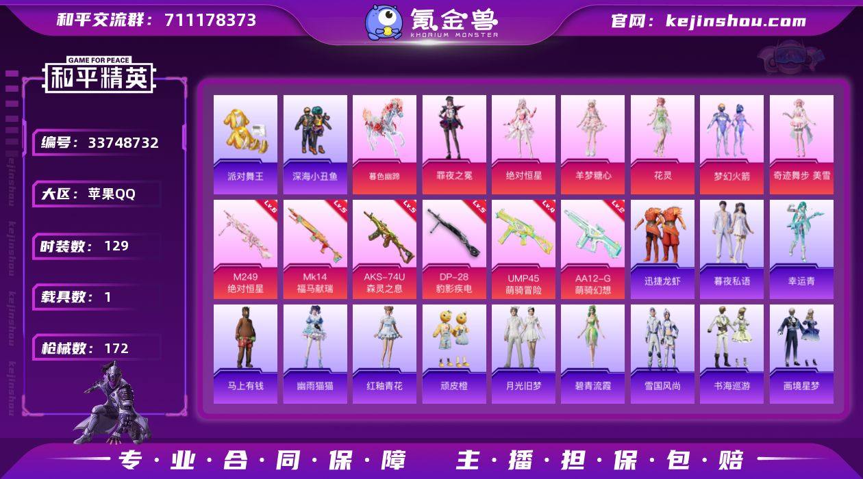 129套装/枪械6/装备206/载具1/战备135/王牌印记6/热力值48221/四级UMP45-萌骑冒险/五级AKS-74U-森灵之息/五级MK14-福马献瑞/二级AA12-G-萌骑幻想/六级M249-绝对恒星/五级DP-28-豹影疾电/梦幻火箭(新101)/派对舞王/深海小丑鱼/龟仙人/潮萌小黄鸭/红熊茄茄/绝对恒星/奇迹舞步-美雪/花灵/羊梦糖心/罪夜之冕/暮色幽蹄/UMP45-萌骑冒险/AKS-74U-森灵之息/MK14-福马献瑞/AA12-G-萌骑幻想/M249-绝对恒星/DP-28-豹影疾电/绝对恒星飞行器/炫彩糖果飞行器/梦幻火箭飞行器/沙丘之主天马飞行器/桃源时光飞行器/暮色之舞飞行器/冰狼掠影飞行器/绝对恒星降落伞/梦幻火箭降落伞/星之彼岸降落伞/樱桃泡泡降落伞/无垠阁降落伞/异瞳寒姬降落伞/炫彩糖果降落伞/暮色玫影降落伞/小鸟芋圆/超感刻度/甜心蒙太奇/雪国风尚/炫彩糖果/顽皮橙/幸运青/马上有钱/暮夜私语/迅捷龙虾/蜜桃派对/粉恋花/紫幽梦/蓝冰羽/猎影月神/彩虹兔/云朵鹅/雪绒豹/乐音/朱霞炽焰/凌霄紫焰/擎苍青焰/喜羊羊/书海巡游/画境星梦/琴音绮想/碧青流霞/月光旧梦/雨过天青/红釉青花/幽雨猫猫/AUG-冰晶雪宝/AKM-影袭/AKM-破晓战魂/AKM-龙的传人/M16A4-蓝色火焰/SCAR-L-夜灯/SCAR-L-红色方程式/SCAR-L-绶带小兔/M416-糯团青竹/M416-蓝色...