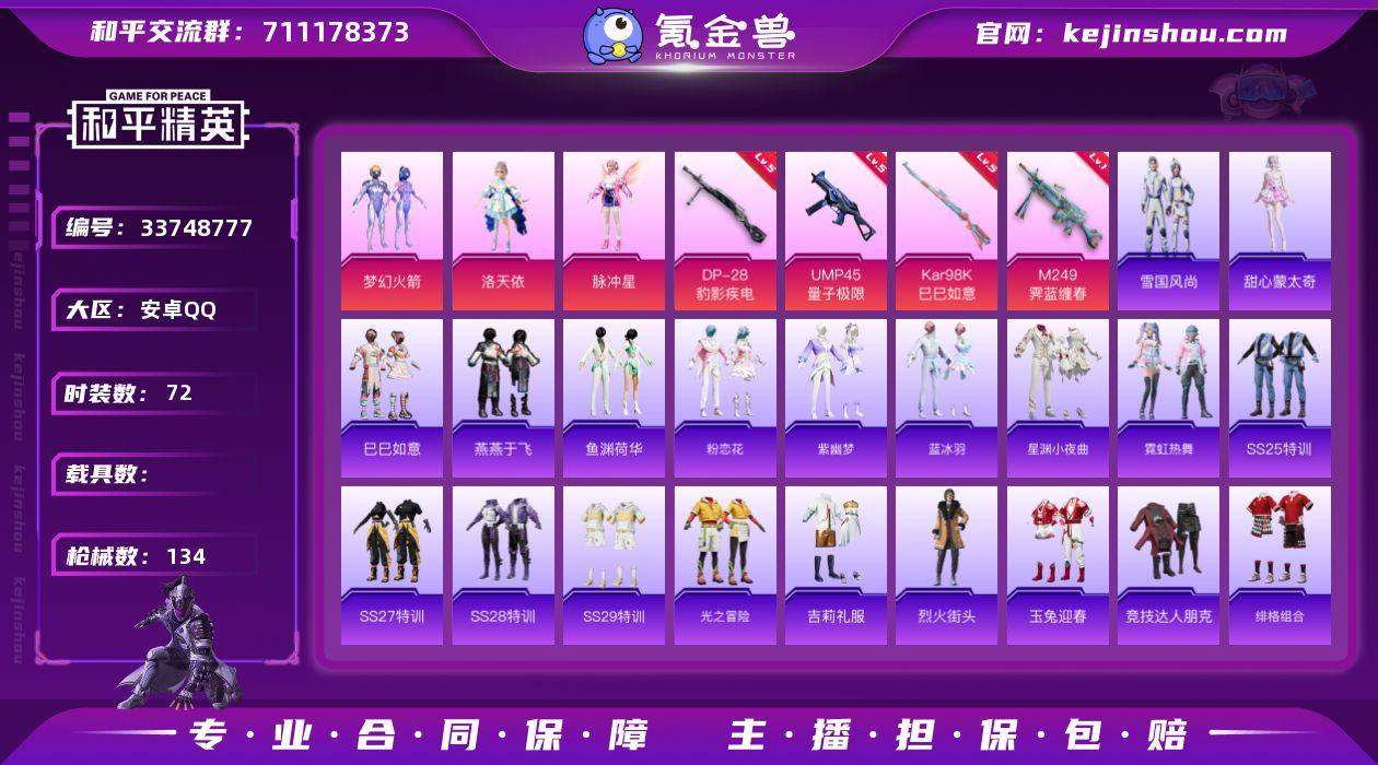 【AZH3723】安卓 手Q【梦幻火箭 洛天依】3粉装-4特效枪-0载具-2粉色飞行器-35600热力值-8王牌印记-72套装-134枪皮 【热门品类】:粉装-梦幻火箭 【粉色套装】:粉装-梦幻火箭,角色-洛天依,角色-脉冲星 【粉色枪皮等级】:UMP45-量子极限(五级),Kar98K-巳巳如意(五级),M249-霁蓝缠春(一级),DP-28-豹影疾电(五级) 【粉色枪皮】:UMP45-量子极限,Kar98K-巳巳如意,M249-霁蓝缠春,DP-28-豹影疾电 【粉色飞行器】:炫彩糖果飞行器,梦幻火箭飞行器 【粉色降落伞】:绝对恒星降落伞,梦幻火箭降落伞,洛神天依降落伞,创世·救赎降落伞,忍者神龟降落伞,星穹咏叹调降落伞,炫彩糖果降落伞,霁蓝缠春降落伞 【稀有套装】:套装-巳巳如意,角色-甜心蒙太奇,套装-雪国风尚,套装-炫彩糖果,套装-燕燕于飞,套装-鱼渊荷华,套装-粉恋花,套装-紫幽梦,套装-蓝冰羽,套装-星渊小夜曲,套装-霓虹热舞 【稀有枪皮】:AUG-冰晶雪宝,AKM-影袭,AKM-破晓战魂,M16A4-红色方程式,M16A4-蓝色火焰,SCAR-L-夜灯,SCAR-L-炫彩节奏,SCAR-L-玉兔迎春,SCAR-L-红色方程式,M416-红色方程式,M416-蓝色火焰,GROZA-影袭,AUG-天降萌叽,AUG-耀粉歌者,QBZ-彩虹符号,M762-天降萌叽,M762-彩...