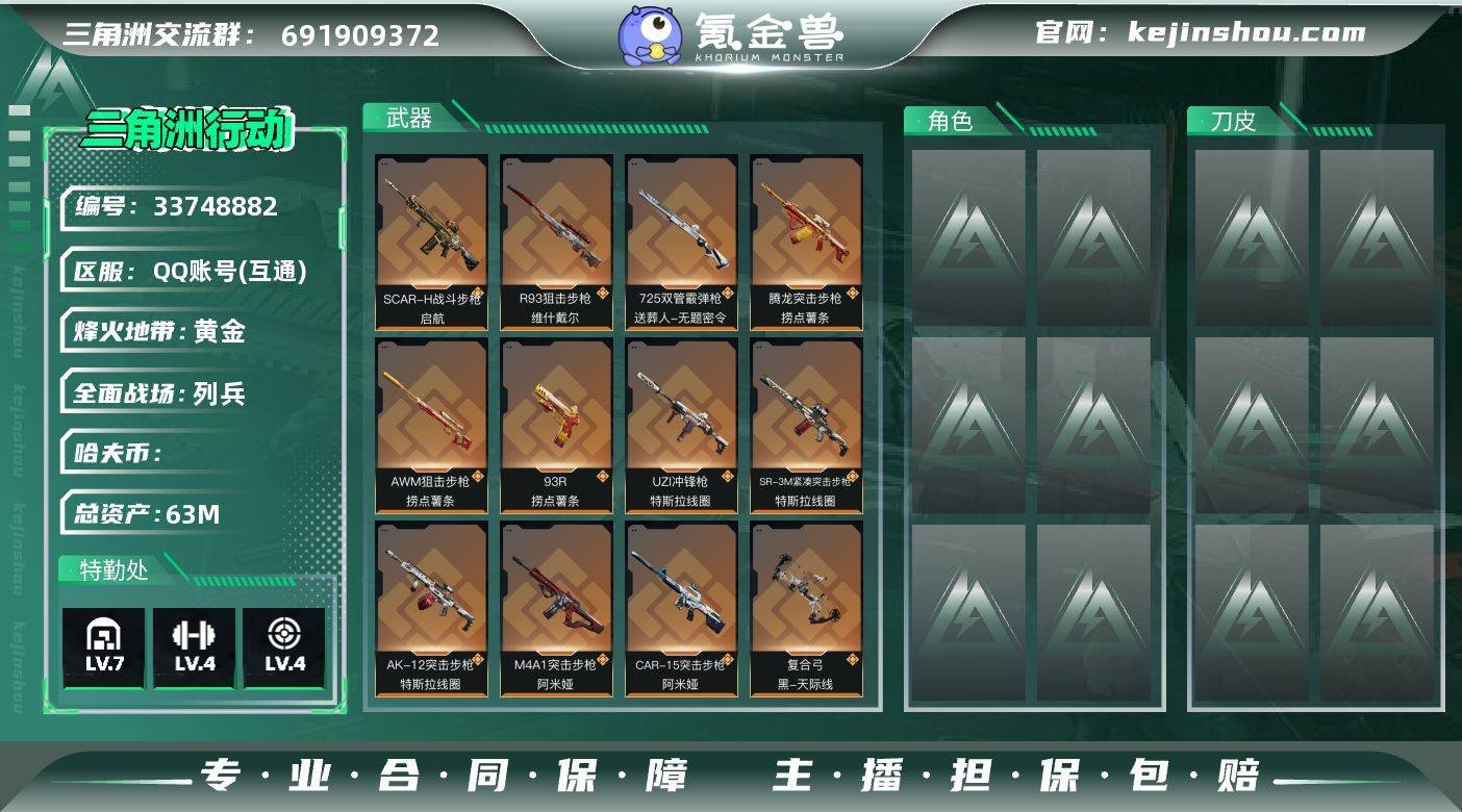 [19005557]总资产:63.5M 13传说枪械 哈夫币:7.082K 可二次 可修改实名 【烽火地带段位】黄金 【全面战场段位】列兵 【传说武器皮肤】UZI冲锋枪-特斯拉线圈,勇士冲锋枪-能天使-午夜邮差,R93狙击步枪-维什戴尔,SCAR-H战斗步枪-启航,AK-12突击步枪-特斯拉线圈,SR-3M紧凑突击步枪-特斯拉线圈,93R-捞点薯条,腾龙突击步枪-捞点薯条,725双管霰弹枪-送葬人-无题密令,M4A1突击步枪-阿米娅,CAR-15突击步枪-阿米娅,复合弓-黑-天际线,AWM狙击步枪-捞点薯条