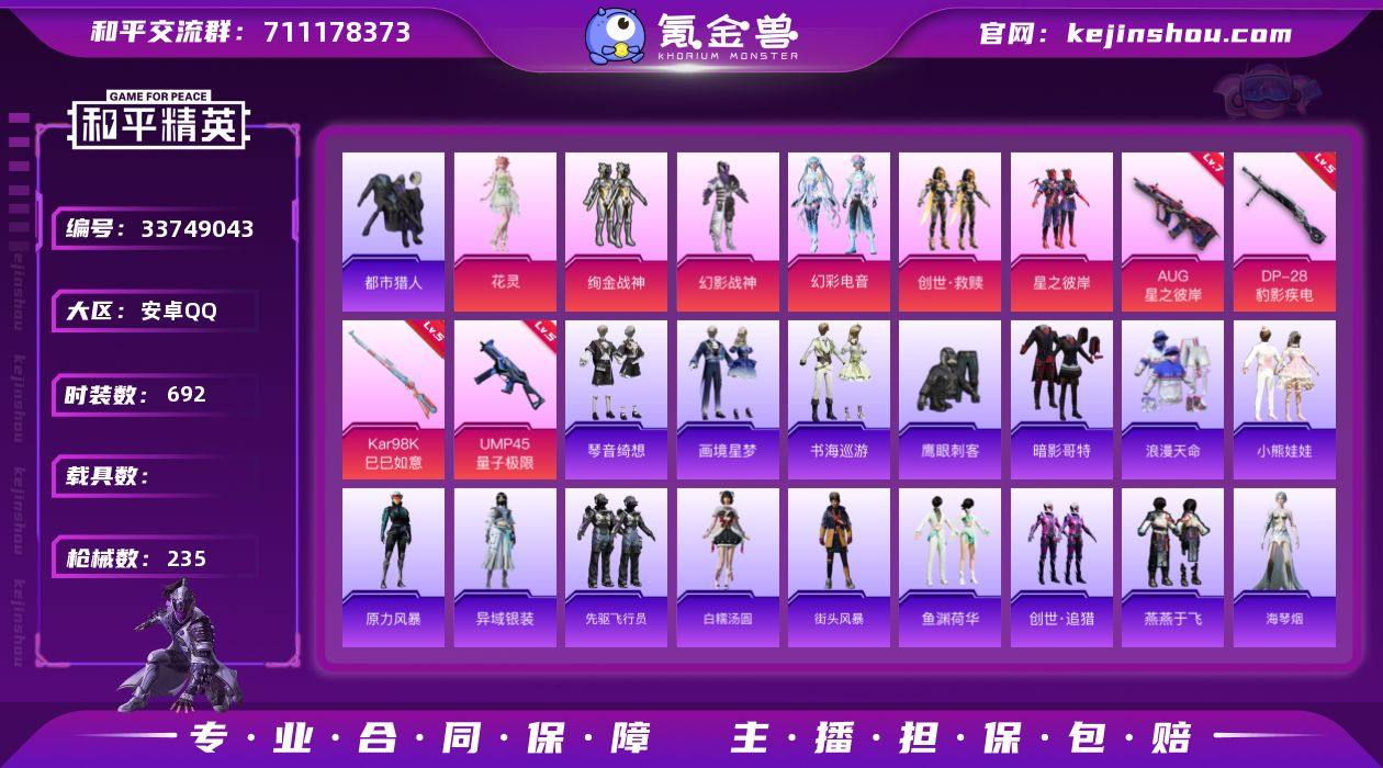 【特价出售】钱包无法注销安卓Q-2稀有6粉装7特效枪10热门177套装235枪皮 67240热力值 9印记 历史超级王牌12星 【2稀有】 都市猎人 浪漫天命 【6粉装】 花灵 创世救赎 幻影战神 幻彩电音 绚金战神 星之彼岸 【7特效枪】 P90-冷漠罗丽 (7级) Kar98K-巳巳如意 (5级) DP-28-豹影疾电 (5级) UMP45-量子极限 (5级) AUG-星之彼岸 (7级) Mk14-福马献瑞 (5级) AA12-G-萌骑幻想 (2级) 【10热门】 Mark.06 暗夜之虎 鹰眼刺客 暗夜之虎 暗影哥特 漫步者 破蛋小黄鸡 极速红龙 军刀雅典娜 英勇保护者 【1飞行器】 星之彼岸飞行器 【2头盔】 幻影战神头盔 深海小丑鱼头盔