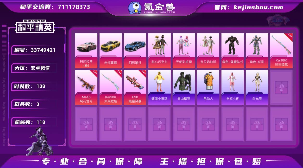 安卓 微信【巧克力三姐妹梦幻火箭放客神游 元气发射 3载具】9粉装-5特效枪-3载具-4粉色飞行器-43544热力值-6王牌印记-108套装-118枪皮 【热门品类】:粉装-梦幻火箭,套装-龟仙人,套装-粉红小猪 【粉色套装】:粉装-甜心巧克力,粉装-宝贝奶油派,粉装-天使彩虹糖,粉装-梦幻火箭,粉装-放客神游,粉装-未来歌姬,角色-阿尔茜,角色-幻影,角色-猩猩队长 【粉色枪皮等级】:M416-风花雪月(五级),P90-能量风暴(五级),Kar98K-未来歌姬(二级),Kar98K-巳巳如意(五级),DP-28-豹影疾电(五级) 【粉色载具】:玛莎拉蒂Ghibli(粉),永恒黄蜂,幻影随行 【粉色枪皮】:M416-风花雪月,P90-能量风暴,Kar98K-未来歌姬,Kar98K-巳巳如意,DP-28-豹影疾电 【粉色飞行器】:炫彩糖果飞行器,梦幻火箭飞行器,极意拳锋飞行器 【粉色降落伞】:甜心宝贝降落伞,梦幻火箭降落伞,炫紫旋律降落伞,心之恋语降落伞,橘柚倾心降落伞,璀璨巨星降落伞,炎氏战神降落伞,未来歌姬降落伞,变形金刚降落伞,圣堂之誓降落伞,幻彩电音降落伞,灵猫魔法师降落伞,炫彩糖果降落伞 【稀有套装】:套装-龟仙人,套装-巳巳如意,套装-炫彩糖果,套装-燕燕于飞,套装-鱼渊荷华,套装-朱霞炽焰,套装-凌...