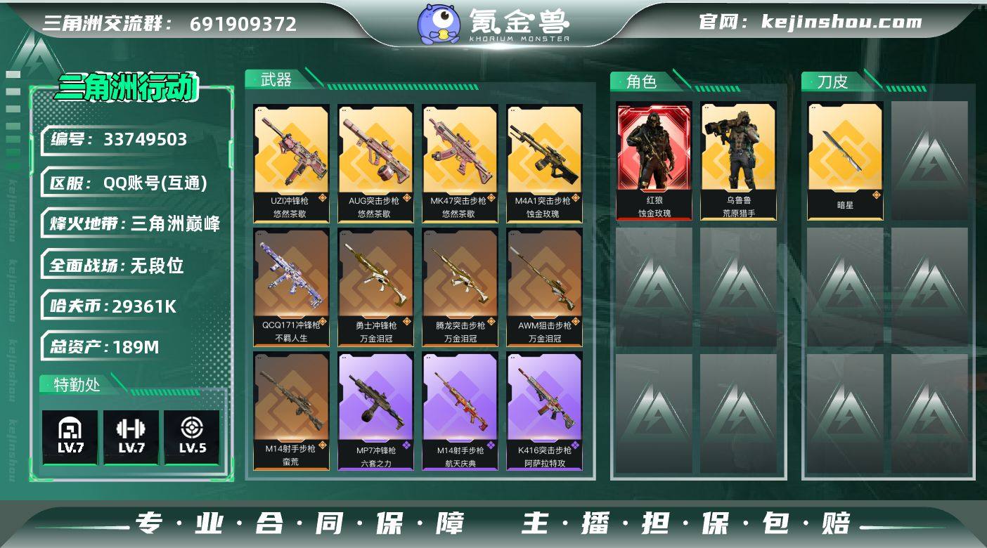 QJR320/包人脸/QQ区【总资产:189M+近战暗星+红皮蚀金玫瑰+金皮荒原猎手】/烽火等级:60/全面战场:1/纯币:29361K/三角券加币:209(40三角币+169三角券)//部门:33332/特勤等级(技术中心3级/工作台3级/制药台3级/防具台3级/仓库7级/指挥中心6级/训练中心7级/靶场5级/潜水中心2级/收藏室1级)---暗星捆绑包---/橙色挂饰x1/流动资产:132M段位:三角洲巅峰X66/详细看图