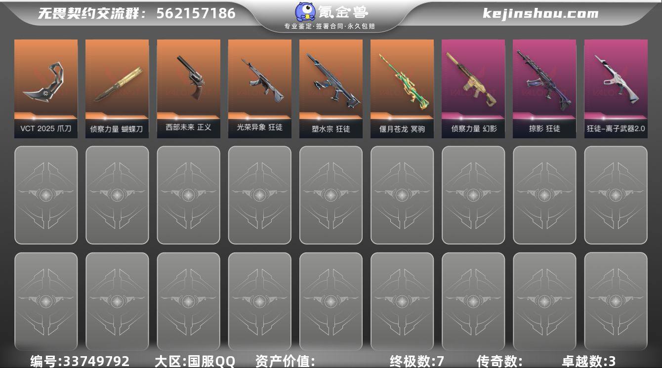 L3496【性价比】离子2.0狂徒 光荣狂徒 vct25爪刀 侦查幻影 西部正义 威龙之刃 苍龙冥狙 掠夺狂徒 侦查蝴蝶刀 塑水宗狂徒 库存: 19870 剩余VP:剩余R点: 段位:历史最高: