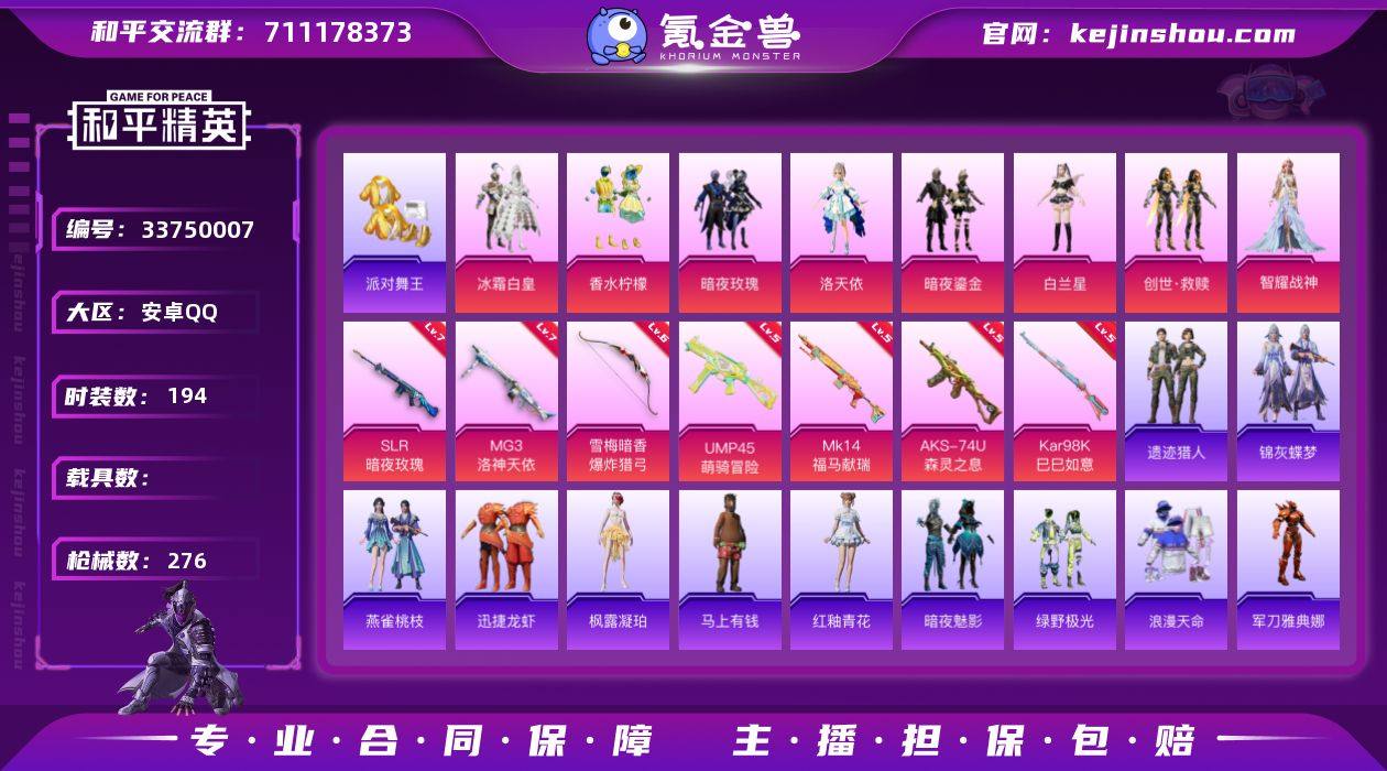 安卓 手Q-8粉装-7特效枪-0载具-4粉色飞行器-88445热力值-10王牌印记-194套装-276枪皮 【热门品类】:套装-浪漫天命,套装-派对舞王,角色-军刀雅典娜,套装-粉红小猪,角色-8号机 【粉色套装】:粉装-冰霜白皇,粉装-香水柠檬,粉装-暗夜玫瑰,角色-洛天依,粉装-暗夜鎏金,角色-白兰星,套装-创世·救赎,角色-智耀战神 【粉色枪皮等级】:UMP45-萌骑冒险(五级),AKS-74U-森灵之息(五级),Kar98K-巳巳如意(五级),Mk14-福马献瑞(五级),SLR-暗夜玫瑰(七级),MG3-洛神天依(七级),爆炸猎弓-雪梅暗香(六级) 【粉色枪皮】:UMP45-萌骑冒险,AKS-74U-森灵之息,Kar98K-巳巳如意,Mk14-福马献瑞,SLR-暗夜玫瑰,MG3-洛神天依,爆炸猎弓-雪梅暗香 【粉色飞行器】:心之恋语飞行翼,齐天大圣飞行器,千面幻镜飞行器,圣域金龙飞行器 【粉色降落伞】:春暖花开降落伞,精灵迷巫降落伞,潮汐统领降落伞,阿狸红降落伞,激战未来降落伞,王牌四分卫降落伞,星之彼岸降落伞,相思残雪降落伞,暗夜玫瑰降落伞,齐天大圣降落伞,洛神天依降落伞,环太平洋降落伞,翩跹演武降落伞,千面幻镜降落伞,雪梅暗香降落伞,萌物绒绒降落伞,莲影清波降落伞,霓虹漫游降落伞,精灵梦叶罗丽降落伞,守...