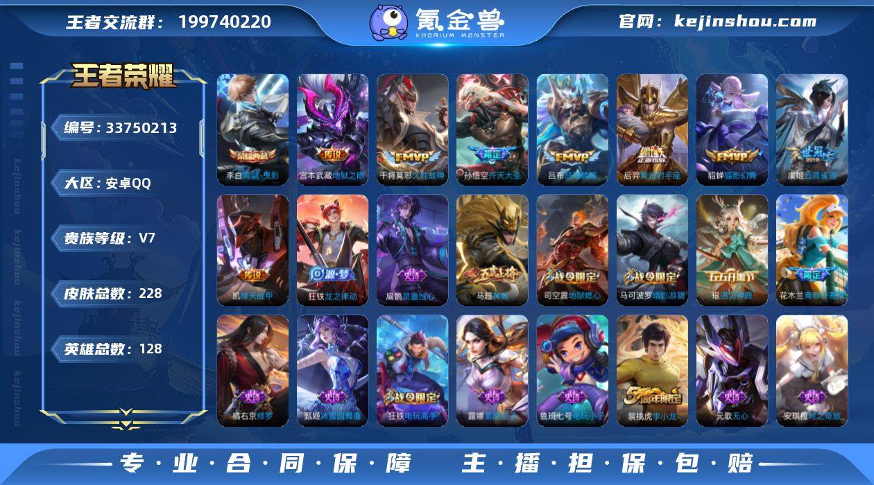 安卓Q-V7-最强王者段位-128英雄-228皮肤-1典藏皮肤-9传说-73史诗 【英雄全皮】:孙权全皮 【荣耀典藏】:李白鸣剑曳影 【传说皮肤】:后羿神树通天,孙悟空齐天大圣,吕布怒海麟威,铠绛天战甲,貂蝉猫影幻舞,干将莫邪久胜战神,虞姬云霓雀翎,后羿黄金射手座,宫本武藏地狱之眼 【限定皮肤】:狄仁杰阴阳师,赵云皇家上将,墨子神迹守卫,庄周高山流水,高渐离死亡摇滚,高渐离玩趣恶龙,阿轲迷踪丽影,钟无艳超时空战士,扁鹊奇幻香踪,白起夜都怪侠,芈月幻夜卜梦,元歌无心,夏侯惇朔风刀,甄姬落雪兰心,马可波罗暗影游猎,狄仁杰魔术师,达摩星际陆战队,达摩沙漠行僧,项羽海滩派对,老夫子醍醐杖,老夫子航海奇遇记,程咬金演武夺筹,刘邦夺宝奇兵,王昭君午后时光,兰陵王金庭之子,花木兰青春决赛季,孙悟空齐天大圣,后羿圣弓游侠,李元芳云中旅人,钟馗驱傩正仪,杨戬潮玩骑兵,干将莫邪真爱魔法,雅典娜黎明之约,鬼谷子原初探秘者,鬼谷子五谷丰年,黄忠火炮绅士,苏烈千军破阵,百里玄策原初追逐者,弈星混沌棋,梦奇顽趣,沈梦溪大漠名商,明世隐疑决卦,明世隐吟游魔法,裴擒虎李小龙,裴擒虎擒涛扼浪,狂铁电玩高手,米莱狄胡桃异想国,盾山御銮,猪八戒西...